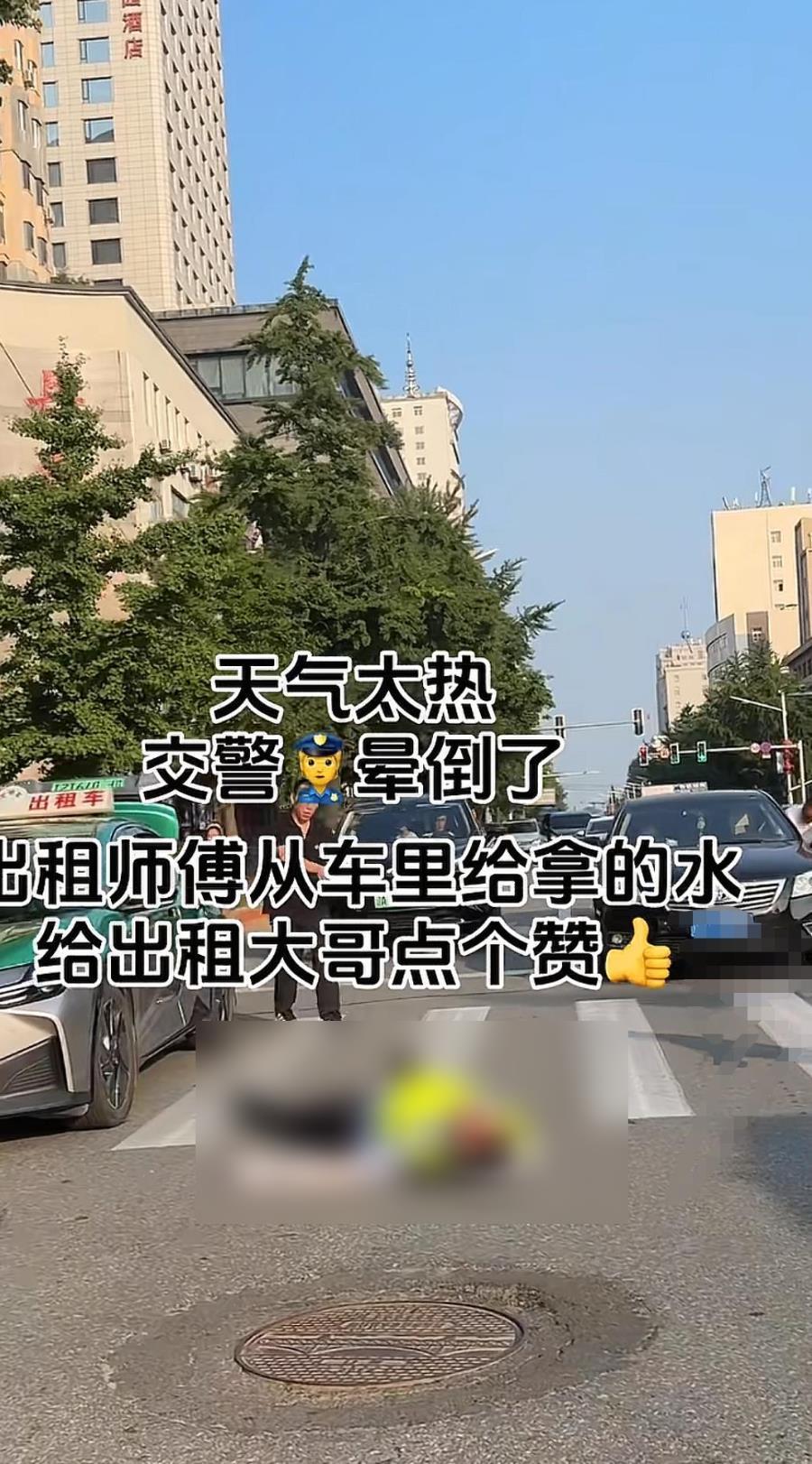 网友拍摄的视频显示,7月9日,一名穿着工作服的交警晕倒在街道的十字路口,一旁等待绿灯的私家车和出租车司机下车查看情况,该出租车司机随即从后备箱拿出一瓶水为交警降温。记者注意到,该路口位于闹市区,事发时有不少市民和车辆经过。