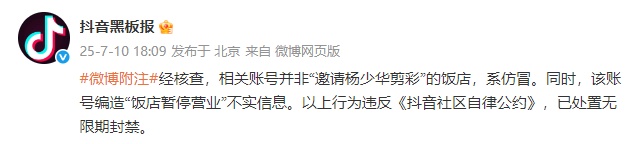 7月10日,@抖音黑板报 发文:经核查,相关账号并非“邀请杨少华剪彩”的饭店,系仿冒。同时,该账号编造“饭店暂停营业”不实信息。以上行为违反《抖音社区自律公约》,已处置无限期封禁。