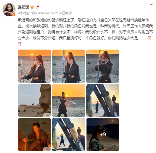 她称:“最近真的和敦煌的戈壁沙漠杠上了,刚在这拍完《金色》又在这无缝衔接继续作业。初次接触短剧,新的形式新的角色对我也是一种新的挑战。昨天工作人员问我长剧短剧连着拍,觉得有什么不一样吗?我说没什么不一样,对于演员来说角色不分大小,戏份不分长短,我只管演好每一个角色就好。你们猜猜这次会是一个什么样的角色?P.S U1S1不管长剧短剧,在戈壁和荒漠拍戏,都挺累的,对自己说,加油。”