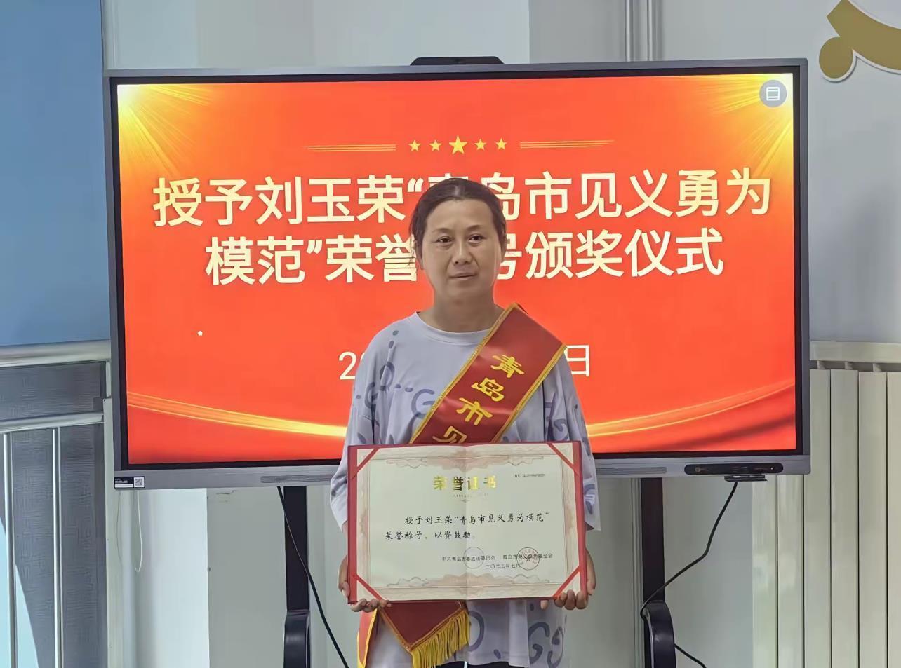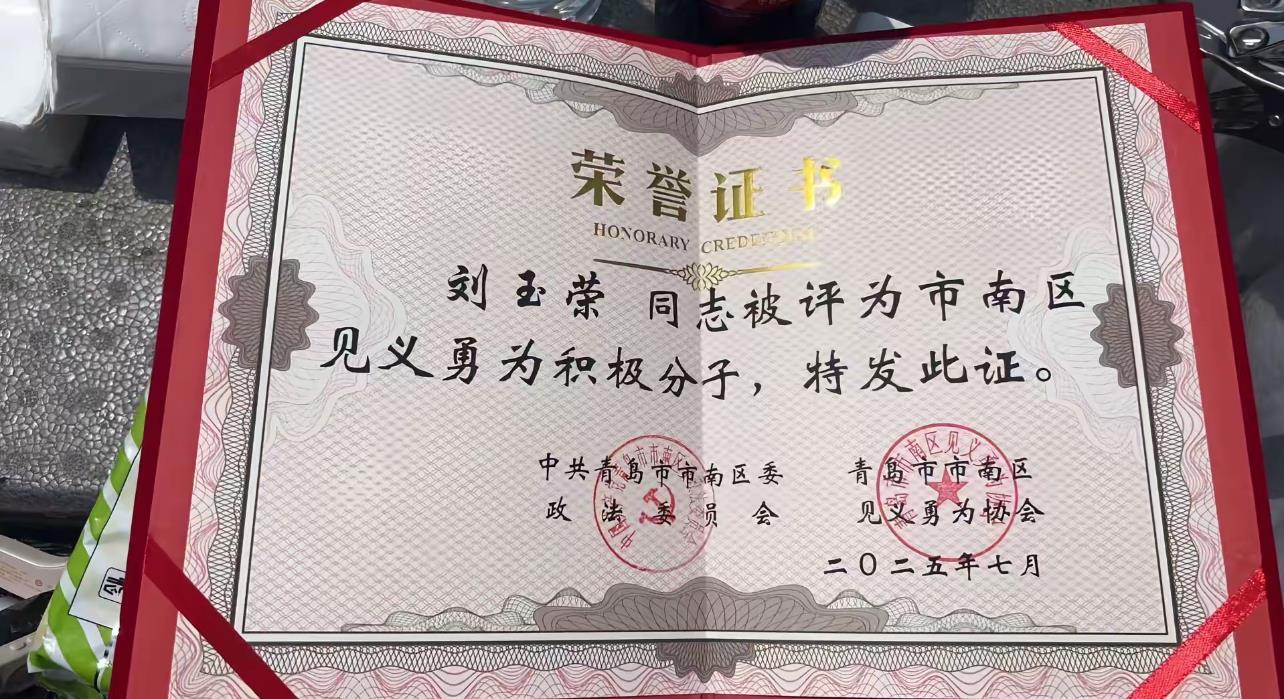11日,极目新闻记者从刘女士的女儿姜女士处获悉,刘玉荣10日获评“青岛市见义勇为模范”、青岛市市南区“见义勇为积极分子”,青岛市及市南区相关部门向她颁发证书。刘玉荣老家安徽省界首市相关部门也于9日晚来到青岛,向她送去家乡人的敬意。