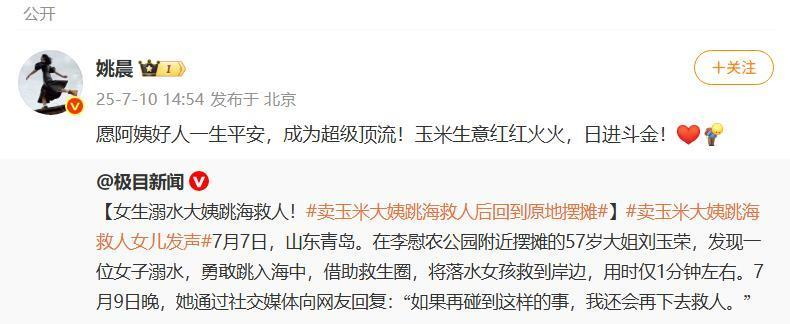 7月10日,演员姚晨在微博转发极目新闻“卖玉米大姨跳海救人后回到原地摆摊”报道,发文祝愿阿姨好人一生平安,成为超级顶流!玉米生意红红火火,日进斗金!11日,刘女士的儿子向极目新闻记者表示,没想到姚晨也关注到这件事情,“我们看到了姚晨发布的微博,非常感谢她的祝福。”他说。