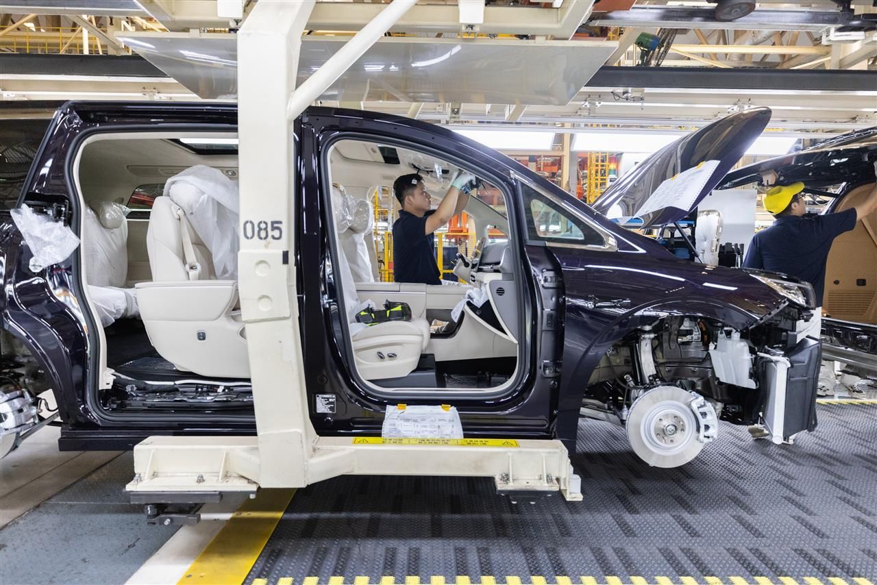 在岚图汽车工厂总装车间,一辆辆黑色的全新岚图梦想家等待下线,这些车辆外观、颜色无差别。