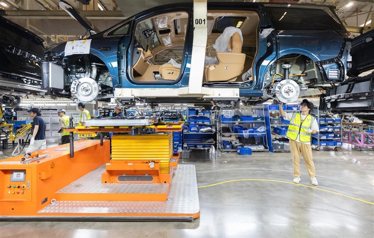 在岚图汽车工厂总装车间,极目新闻记者看到,AGV智能搬运机器人满载零部件,沿既定轨道驶向装配生产线。总装线上,工人们围绕车架来回忙碌,熟练地安装零件、组装车辆,通过内饰、底盘、最终装配等多道工序,一辆辆崭新的岚图汽车不断下线。岚图汽车工作人员介绍,935台工业机器人协同作业,每118秒即有一辆整车下线。