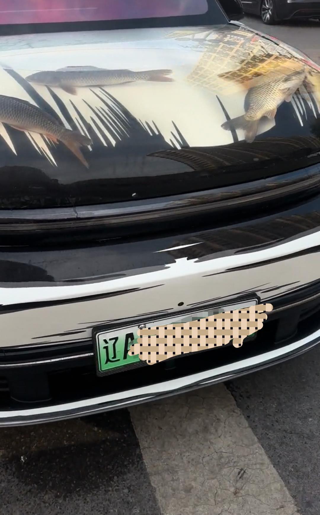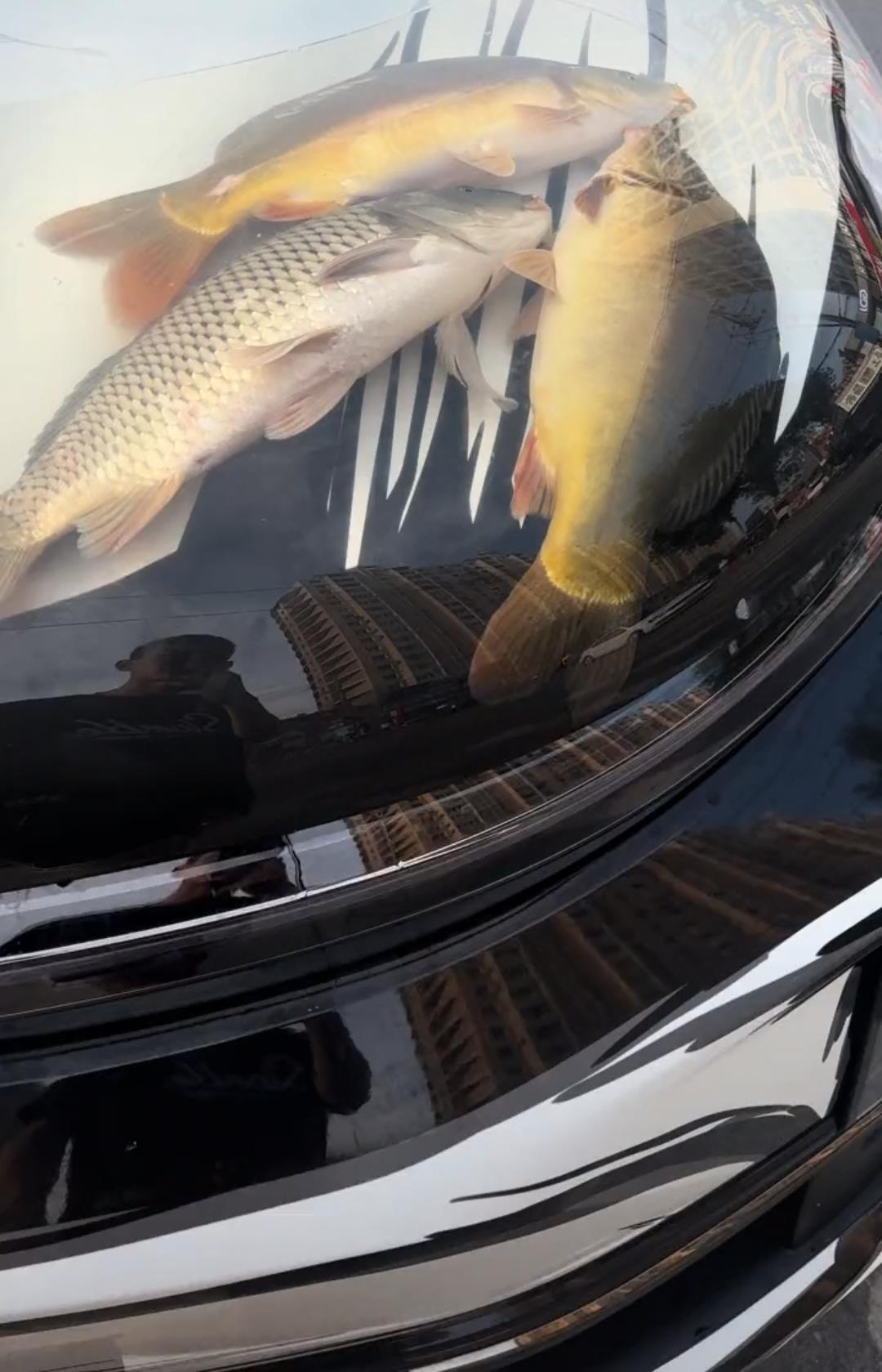 网友拍摄的视频显示,一辆新能源汽车的引擎盖上养了几条鱼,引擎盖与车衣之间充满了水和鱼。其车衣鼓鼓的,拍摄视频的网友用手按压车衣时,会有一些弹性。记者注意到,车衣与引擎盖之间形成一道屏障,从远处看宛如琥珀。