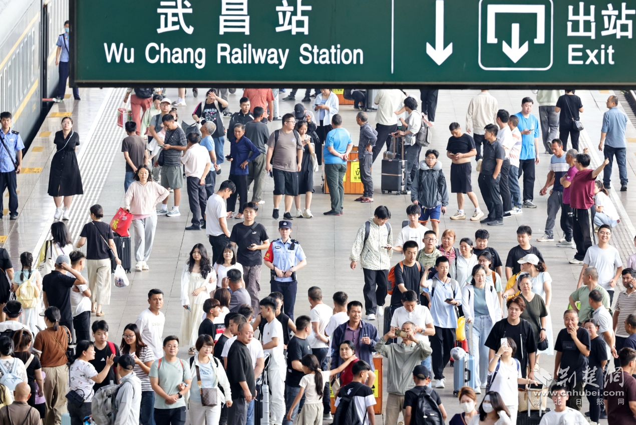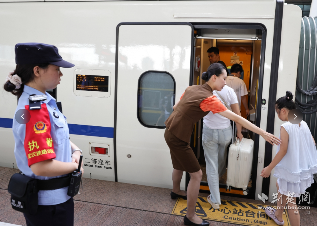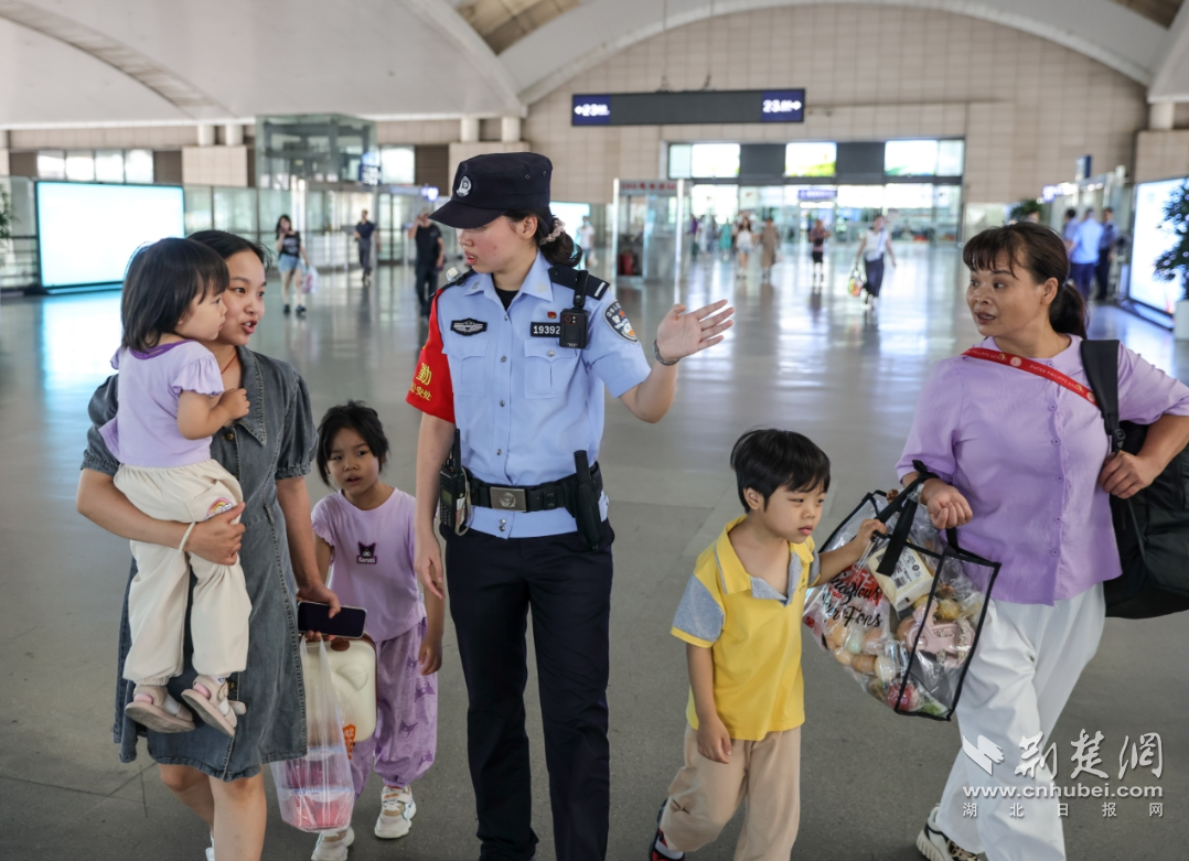 荆楚网(湖北日报网)讯(通讯员陈诚 杨梦君)七月的武汉,骄阳似火,热浪如潮。武汉铁路公安民警和铁路工作人员坚守武昌、武汉和汉口站运输一线,从引导旅客有序上下车,到检查站台安全设施,为车站安全高效运转保驾护航。“越是天热,旅客越容易急躁,我们多一分耐心,大家的出行就多一分顺畅。”武汉铁路公安处武昌站派出所所长陈鹏说。