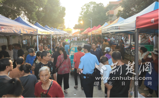 荆楚网(湖北日报网)讯(通讯员 姚薇 刘璠)7月13日,沙洋县后港镇“蛟尾烟火场·拾味旧时光”赶集活动现场烟火升腾,人气十足。后港水陆派出所民警辅警深入熙攘人群,用亲切方言开展反诈宣传。