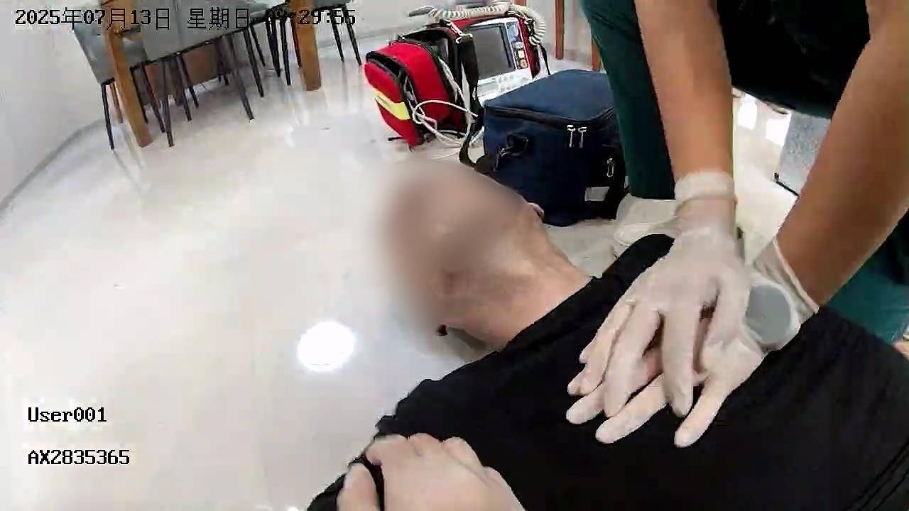 4分半钟后,火速赶到的医护人员立即接手抢救,对心脏骤停的患者实行除颤和心肺复苏,随后将患者送往医院。
