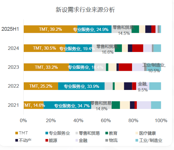 戴德梁行数据显示,上半年,武汉甲级写字楼市场新增供应10.8万平方米,推动全市核心商务区甲级写字楼总存量升至331.1万平方米。得益于新增项目前置预租策略,核心商务区净吸纳量达4.4万平方米,同比增幅29.7%。分行业来看,TMT、专业服务业和金融三大甲级写字楼传统客户仍然是支撑市场存量去化的主要需求来源。