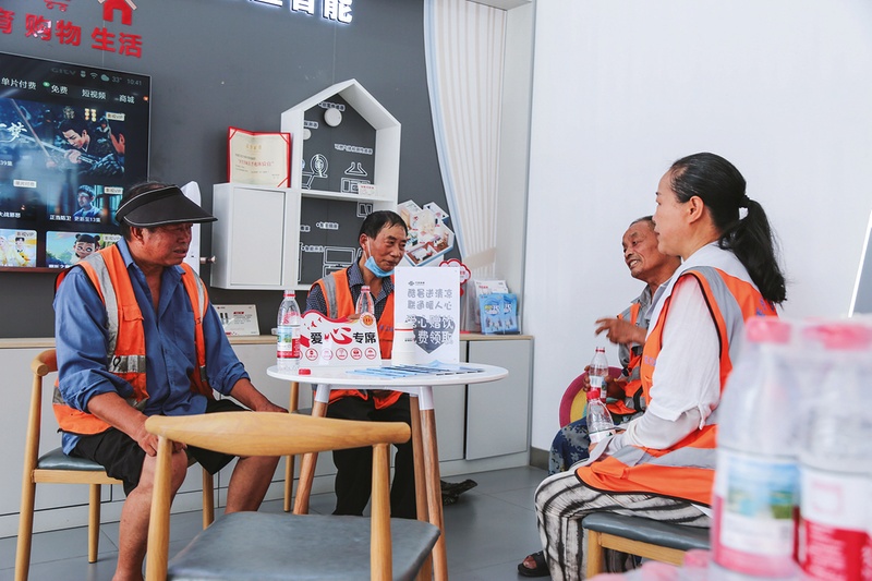 “劳动间隙来这里喝点水、吹吹凉风,真的太舒服了!”环卫女工张大姐激动地说,“我每天4点多起床,总是携带一个3斤重的大水壶上班,天气太热时根本不够喝,只好忍着中午回去再喝。现在有了爱心驿站,可以随时喝到凉水,还能进到屋里歇歇脚、吹吹空调,真的很感激!”