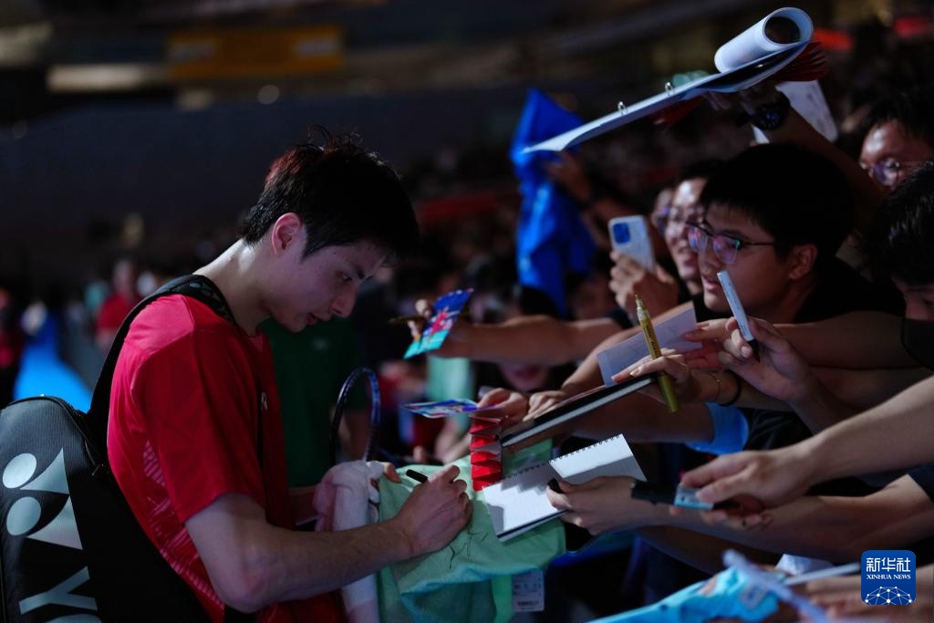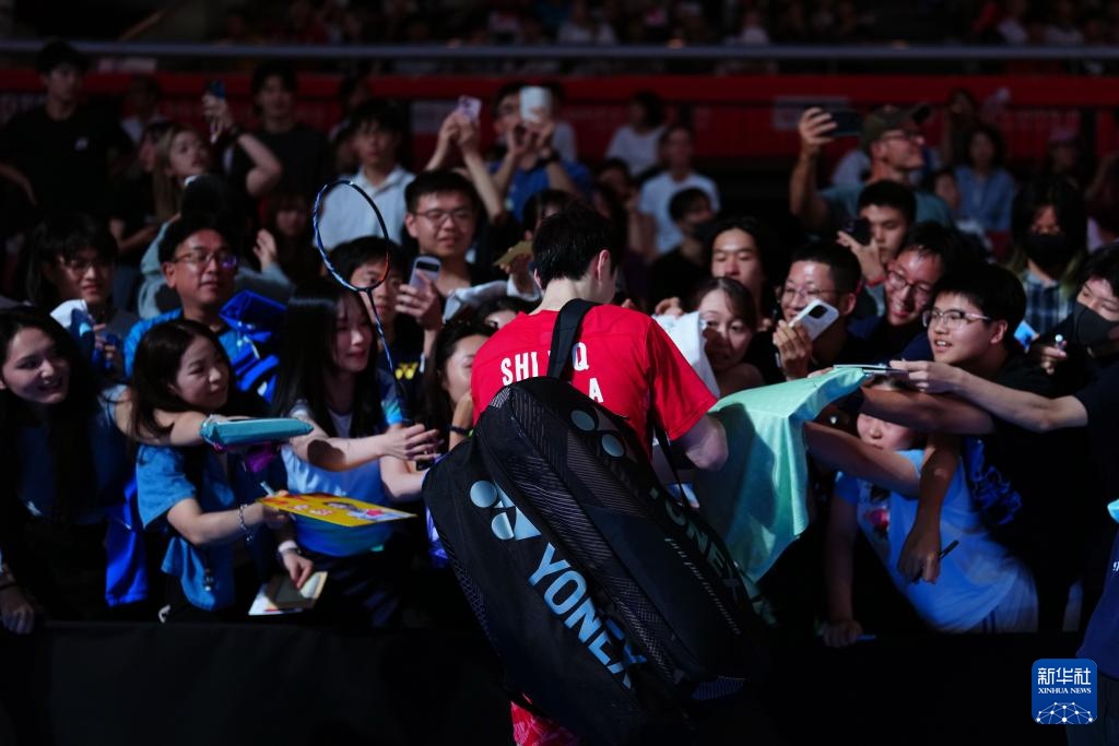 7月16日,石宇奇(中)在比赛后为球迷签名。新华社记者 贾浩成 摄