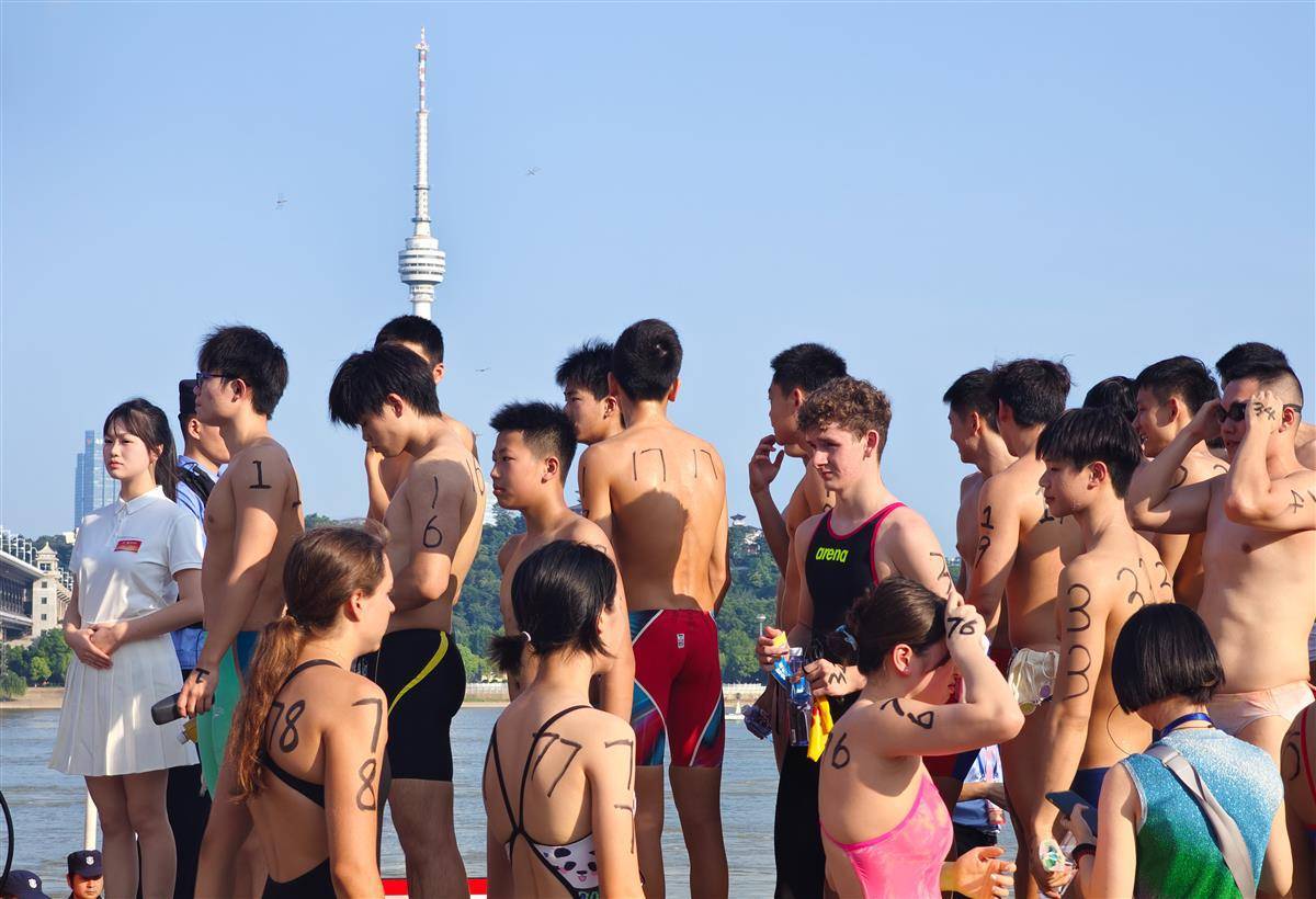 参加个人抢渡长江挑战赛的游泳健儿们准备比赛。