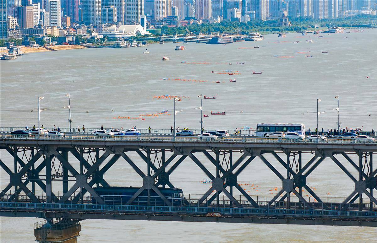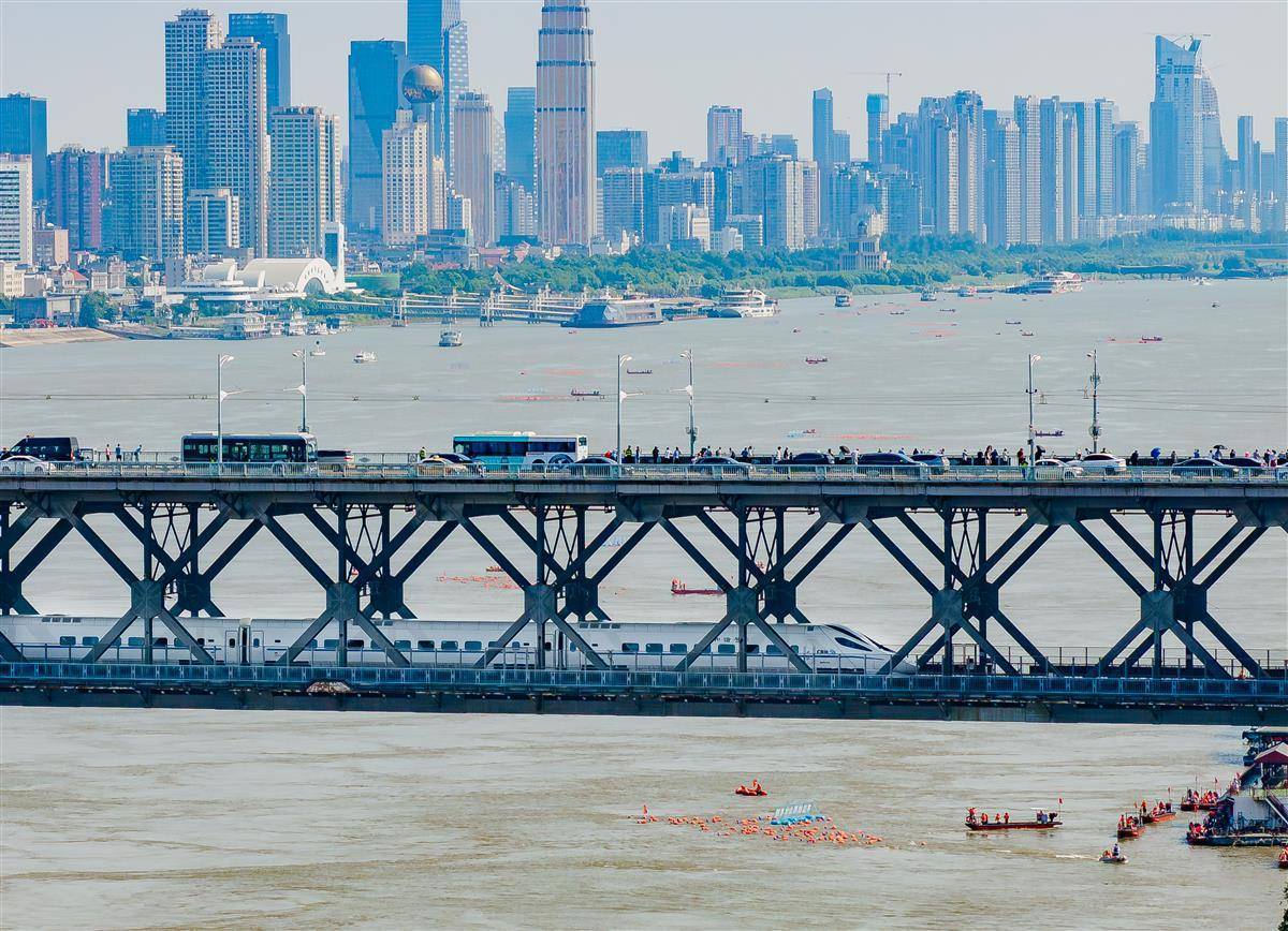 7月16日,一列动车组列车驶过武汉长江大桥,和远处长江江面上横渡长江的群众方阵同框。