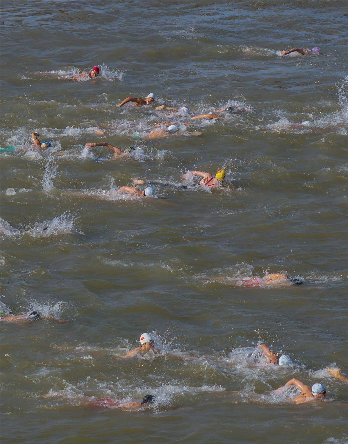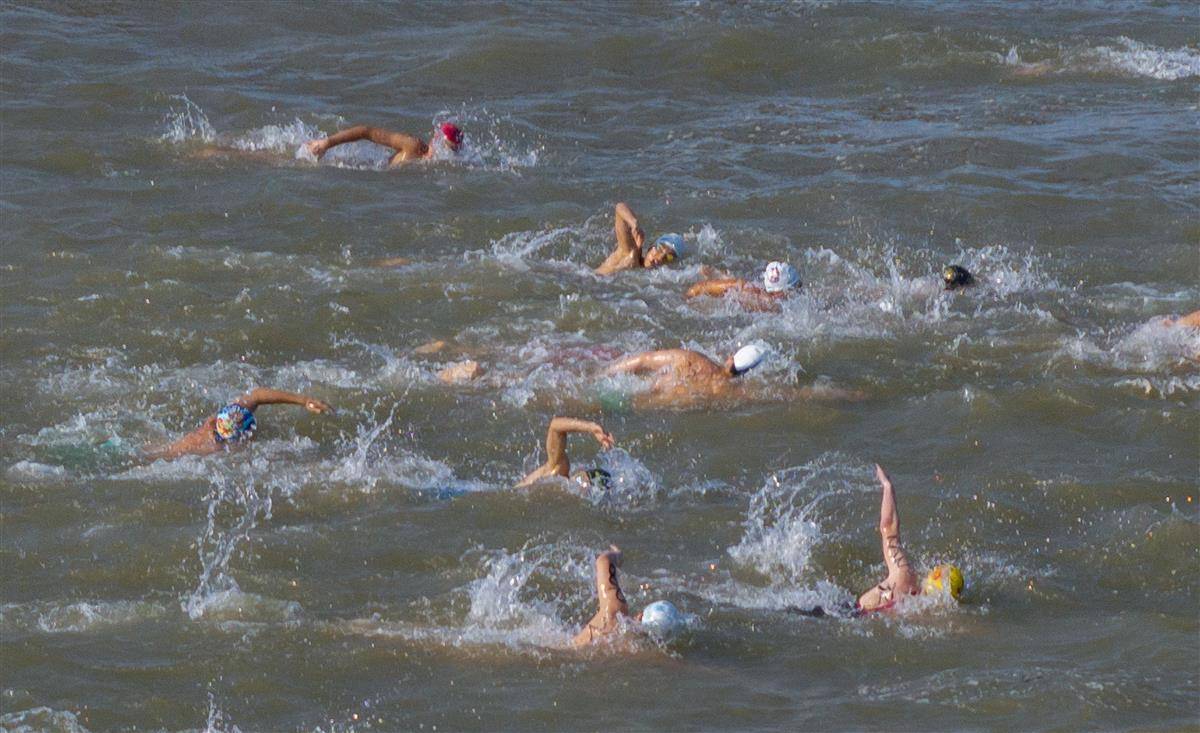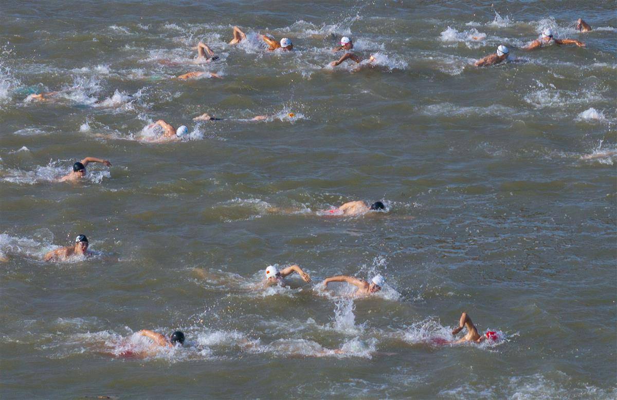 7月16日,运动员在抢渡赛中劈波斩浪。