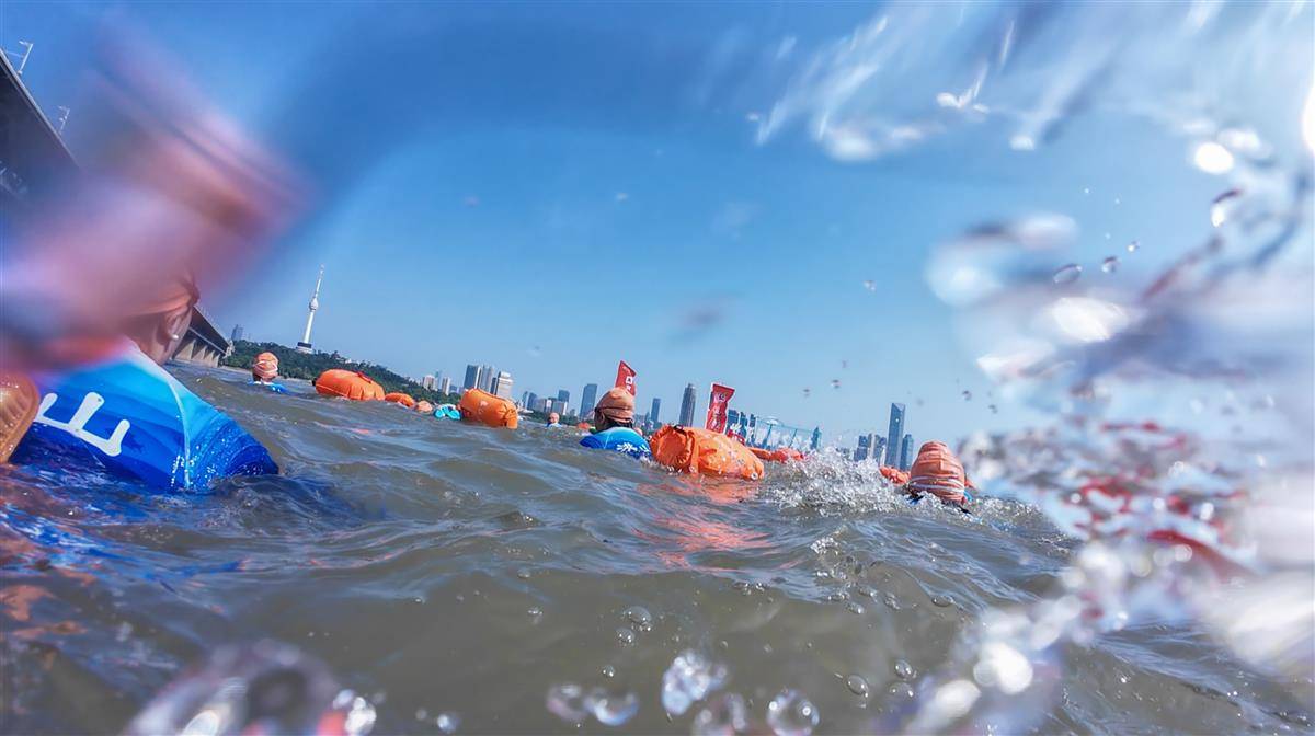 群众横渡方阵里的游泳爱好者正游向起水点。(湖北日报全媒记者 何蕙亦 摄)