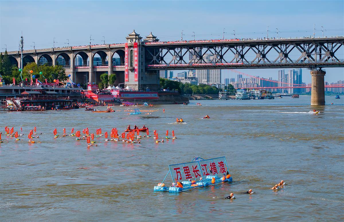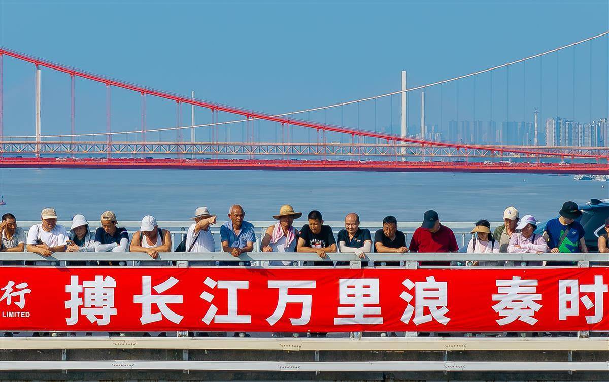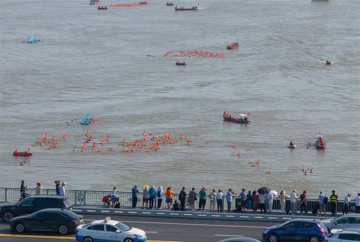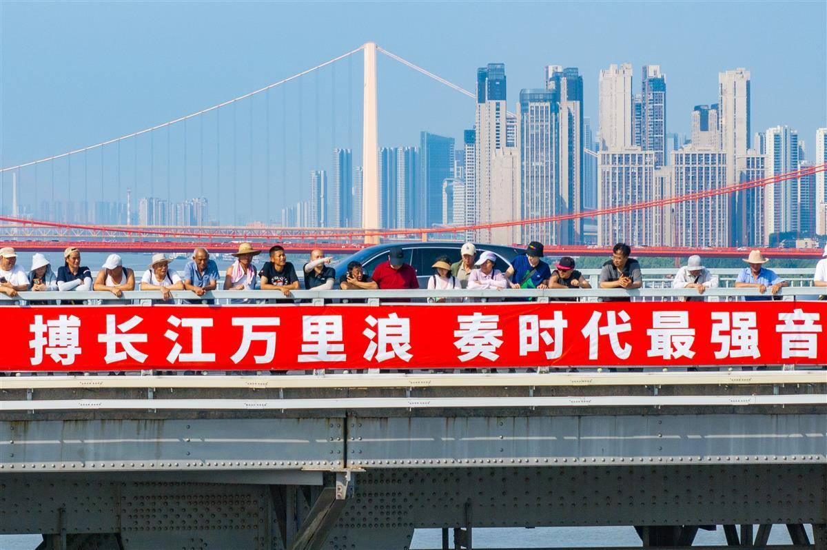 市民和游客在武汉长江大桥桥面观摩渡江节盛况。