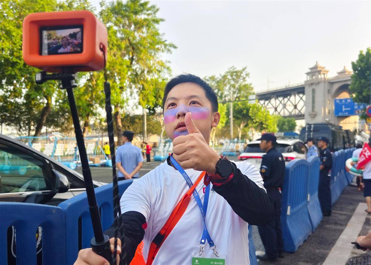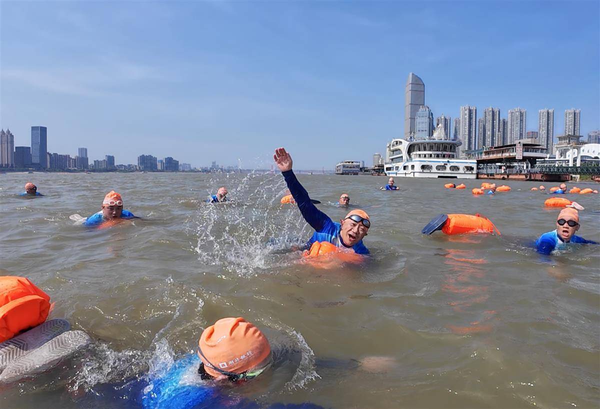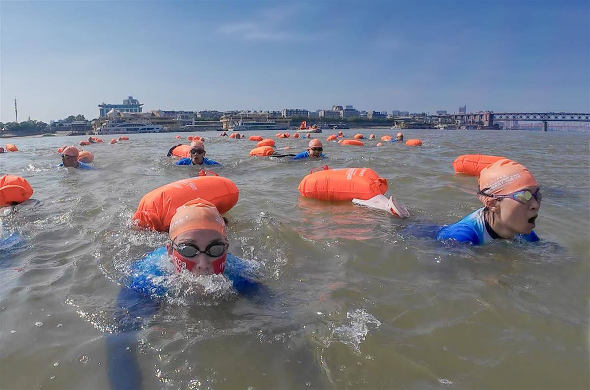 游泳爱好者带着自拍装备准备横渡长江。