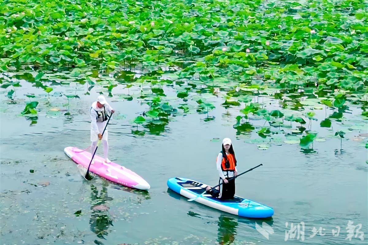 划着划着,一不小心就闯进了天然的“藕花迷宫”。四周是撑开的、微微摇晃的荷叶绿伞,粉白相间的花丛里,偶尔探出一抹亮眼的红,仿佛在调皮地对你眨眼睛。2024年全国桨板运动冠军张昊也教练说:“水上赏荷,就是和大自然来个平视的对话,近距离感受她的小脾气和温柔。”这份体验,岸上可找不到。