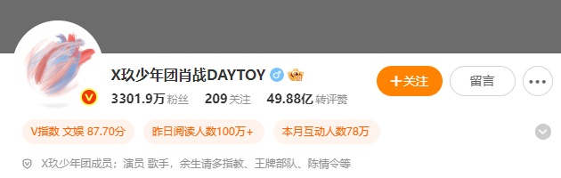 公开资料显示,X玖少年团,中国内地流行乐男子演唱组合,由肖战、夏之光、焉栩嘉、赵磊、彭楚粤、伍嘉成、谷嘉诚、郭子凡组成。