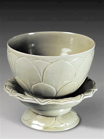 苏州博物馆收藏的五代越窑秘色瓷莲花碗,是该馆的三件国宝文物之一,由碗与盏托组成,堪称瓷中珍品。其造型如盛开莲花,高雅出尘。碗身外壁、盏托盘面和圈足,皆饰重瓣莲花,如浮雕般凸起,釉色晶莹润洁,让人仿佛看到古时匠人,正凝神静气,以瓷为笺,绘莲之姿。于是,千年前的荷香,便透过这温润器物,悠悠飘至眼前。
