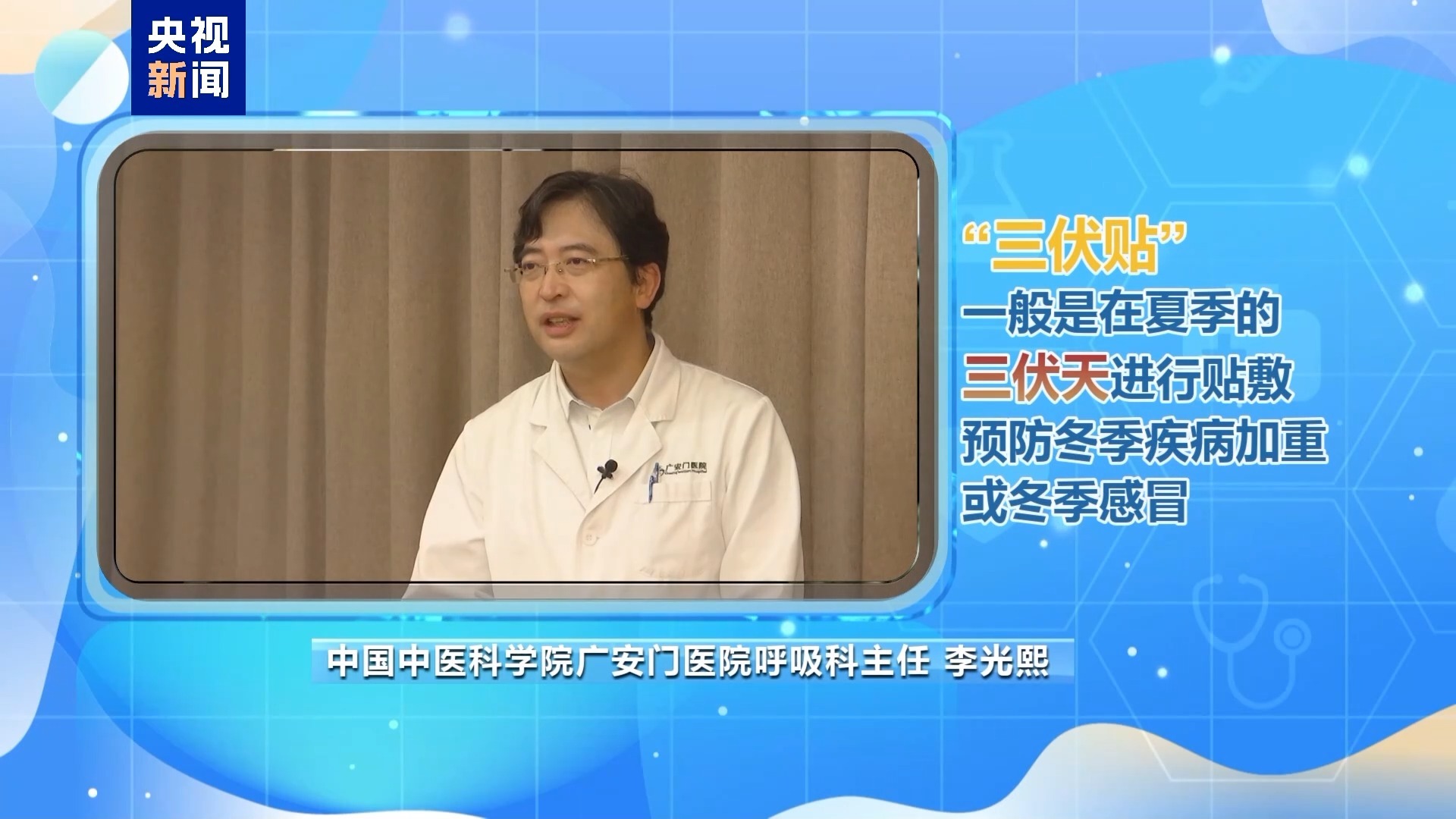 中国中医科学院广安门医院呼吸科主任 李光熙:“三伏贴”一般是在夏季的三伏天进行贴敷,来预防冬季的疾病加重,或者预防一些冬季的感冒。它最适合的人群是一个阳虚的人群,它怎么观察疗效是要连续贴敷三年,来看冬天疾病发作次数是不是减少了,感冒次数是不是减少了,是这样的一个贴敷方法。