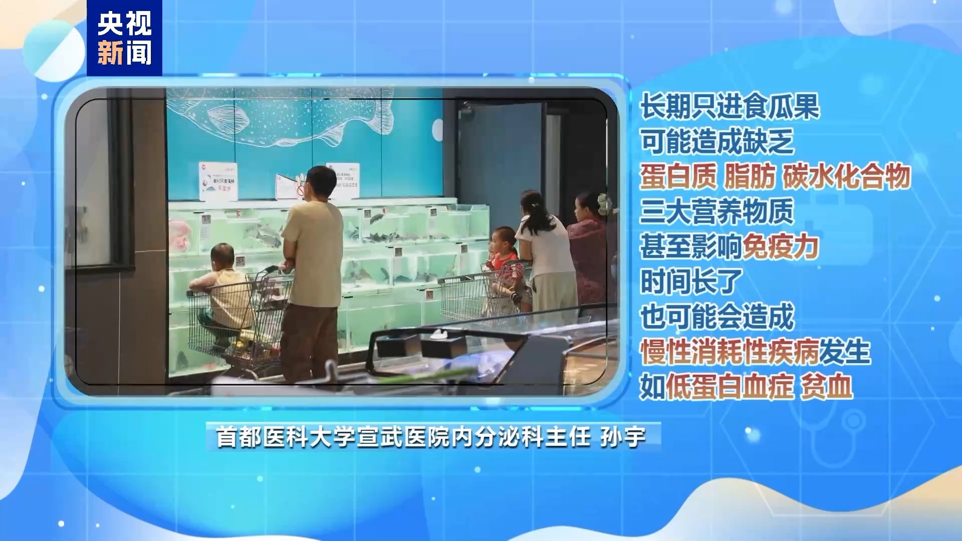 首都医科大学宣武医院内分泌科主任 孙宇:这个说法不正确。我们要吃瓜果蔬菜是因为它富含水分,还有膳食纤维,但是其实它缺乏了蛋白质、脂肪甚至碳水化合物。如果我们长期只进食瓜果的话,那么会有可能造成这三大营养物质的缺乏,甚至影响到我们免疫力。时间长了也可能会造成一些慢性消耗性疾病发生,比如说低蛋白血症、贫血都有可能出现。