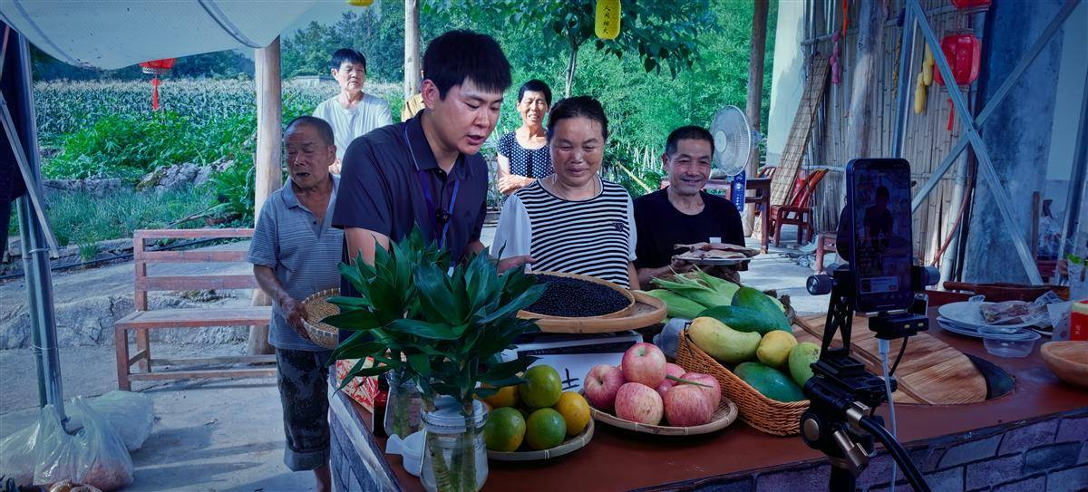 “直播间的朋友们,看看我们今天都有些什么,来来来,请我们农民伯伯叔叔阿姨们举起你们手中的东西,给我们直播间的朋友们看一看……”主播“乔治姑姑”热情地招呼村民们走到直播镜头前,展示手中的农产品。