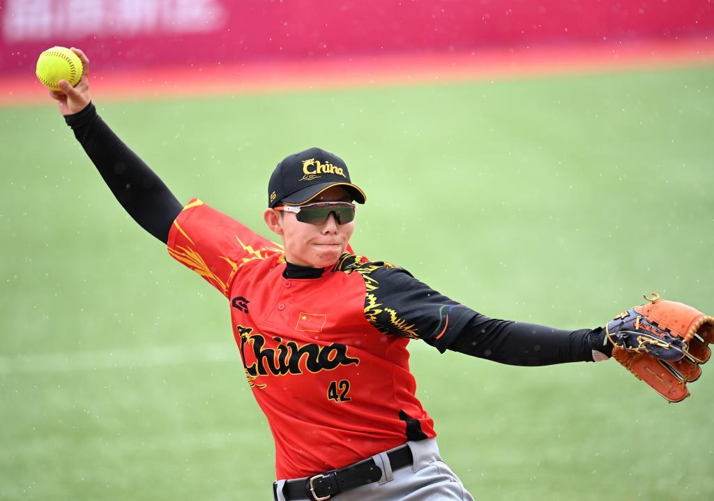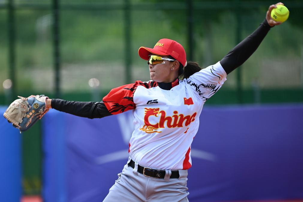 7月15日,中国队球员魏语辰在比赛中投球。新华社记者 邹竞一 摄