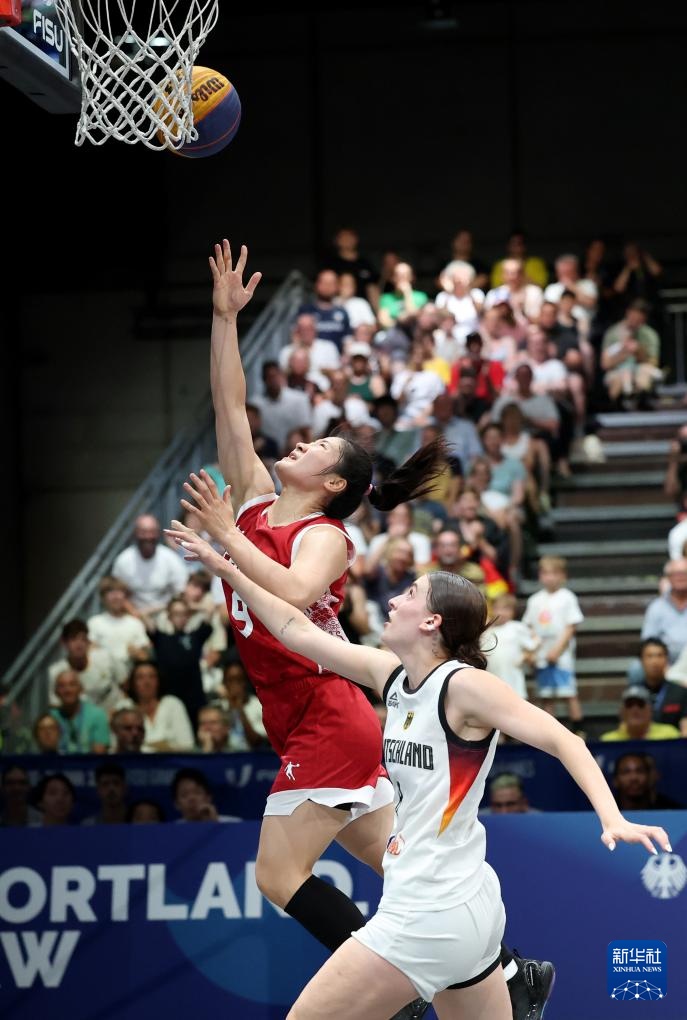 7月20日,中国队球员高梓悦(左)在德国队球员路易莎·玛丽·纽弗的防守下上篮。新华社记者 张晨 摄