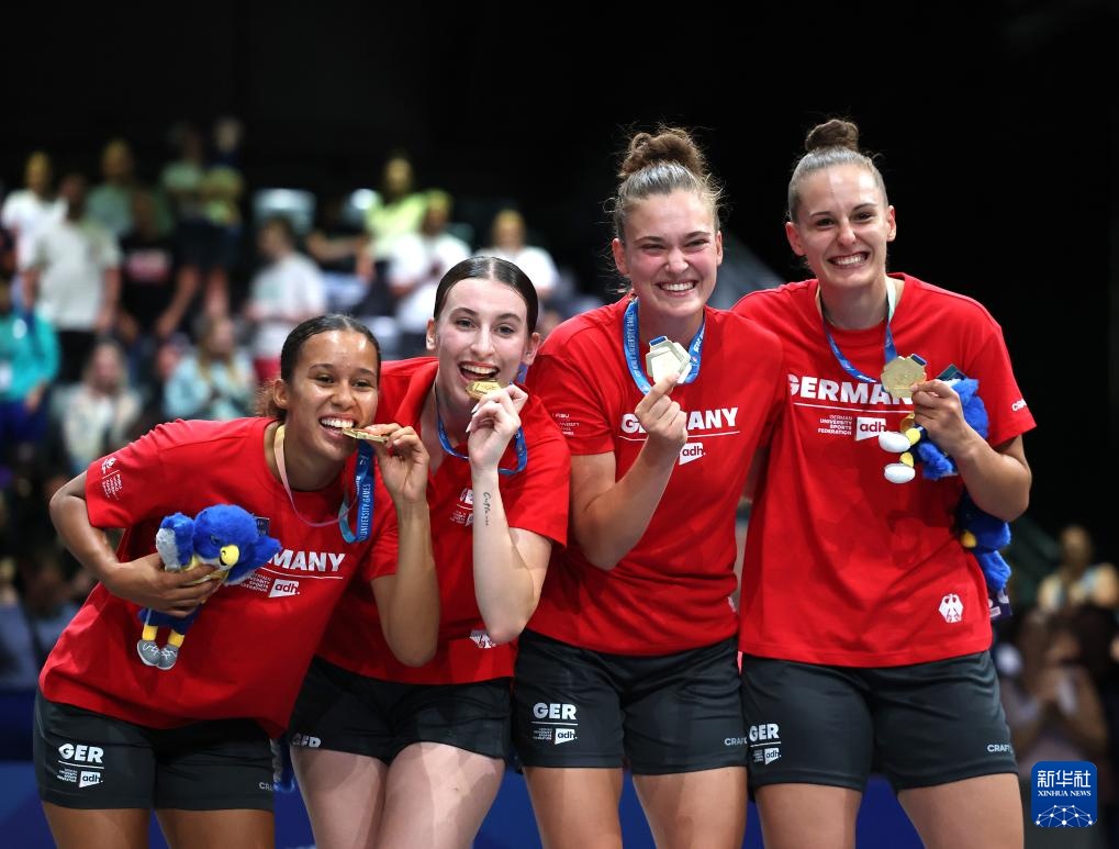 7月20日,冠军德国队(中)、亚军中国队(左)和季军美国队在颁奖仪式上合影。新华社记者 张晨 摄