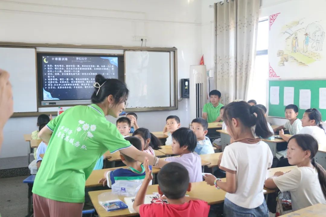 在声母韵母教学课上,队员徐怡然别出心裁地把拼音卡片做成了当地果蔬的样子——“b”像饱满的茄子,“p”像撑开的豆角。同时收集花西乡方言中易混淆的发音,比如把 “sh” 读成 “s”,通过对比练习、绕口令挑战,让孩子们在纠错中掌握标准发音。
