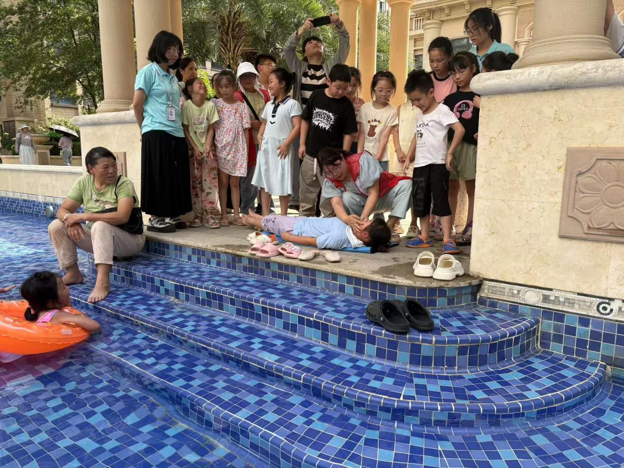 最后,在小区公共游泳池旁开展实地演练,模拟儿童落水场景,小区安全员、社区工作人员、红十字会专业救护人员现场展示了发现、呼救、救援、实施简易心肺复苏等应急处置流程,场面紧张有序,操作规范实用。现场孩子们认真聆听、积极参与,有的主动复述了“六不”原则,教育引导效果显著。