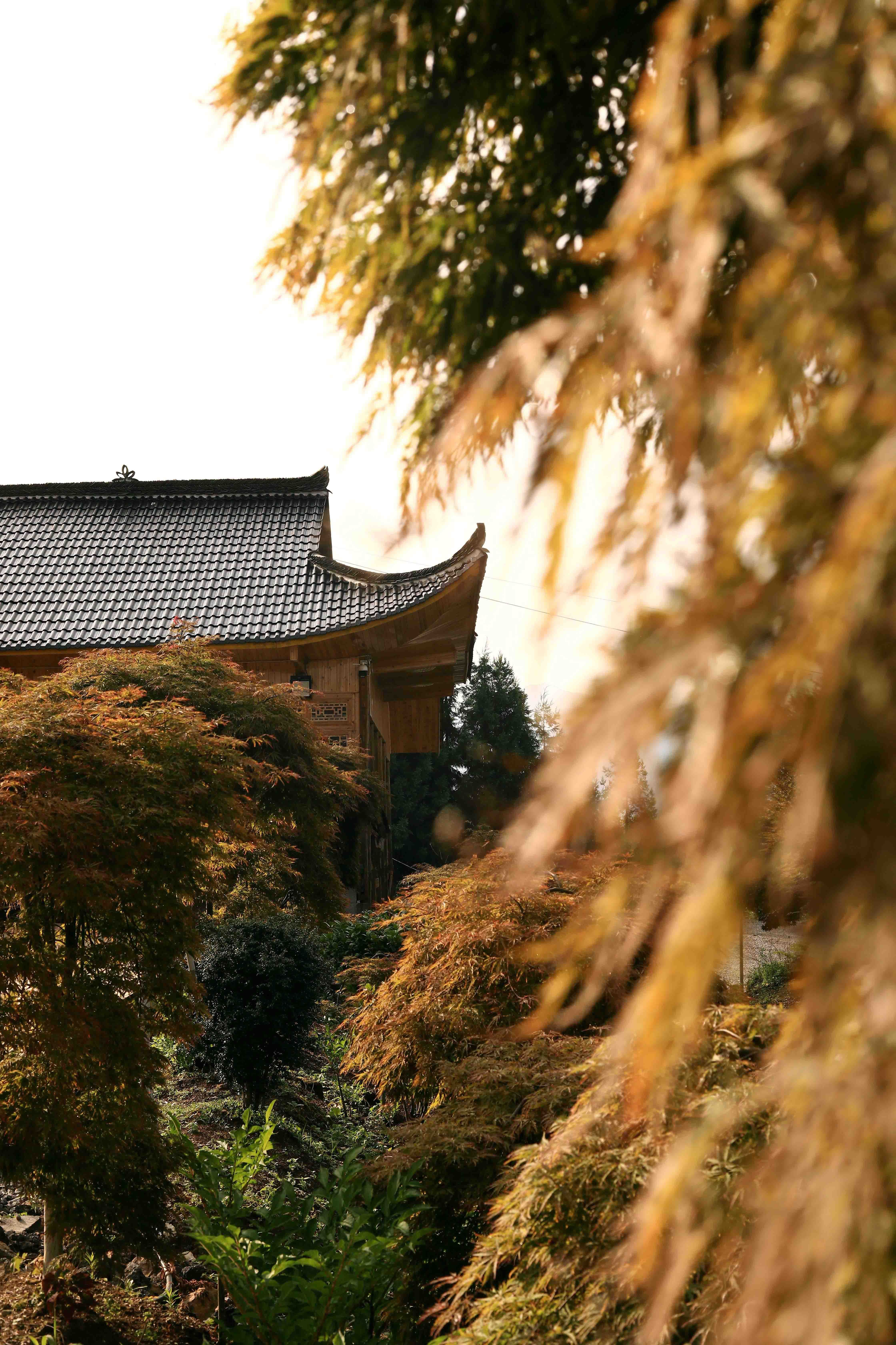 红枫在盛夏时节展现出独特的魅力,远远望去,红枫与绿树相互映衬,宛如一大团燃烧的火焰,染红了天际,与周边民居构成了一幅绝美的秀美乡村图。