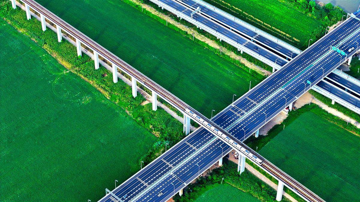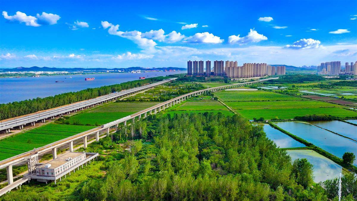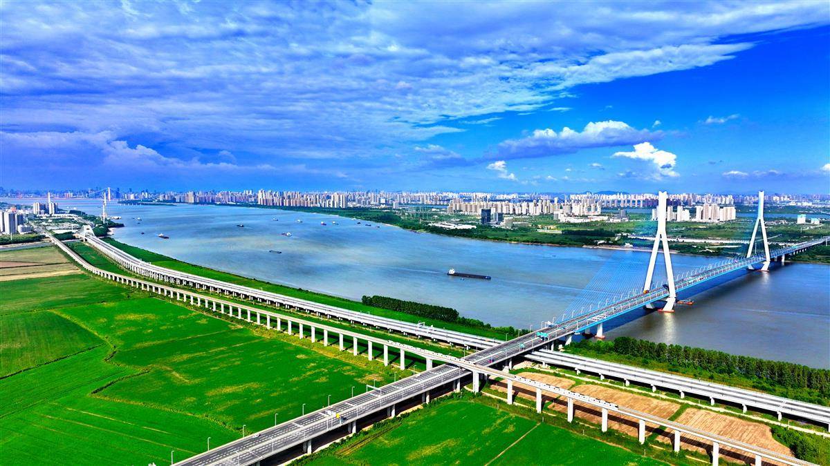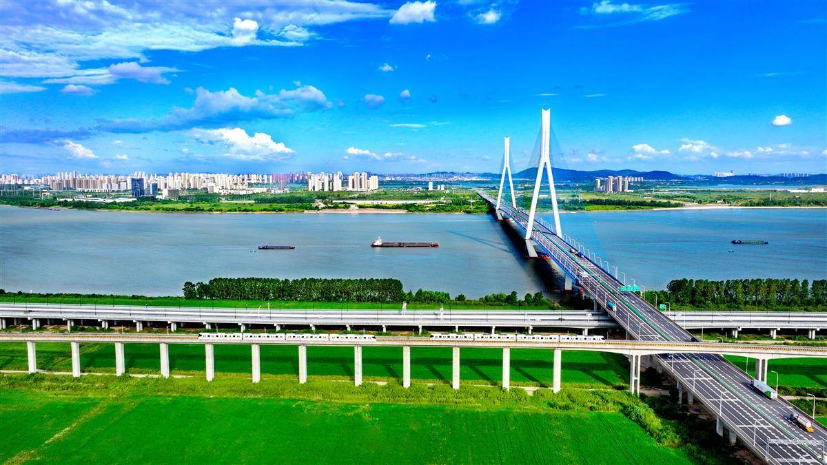 盛夏时节,炽烈阳光铺洒于壮阔的长江左岸。武汉地铁16号线沌口站至小军山站约8公里高架区段,沿着长江与左岸大道并行,在空中与沌口长江大桥、四环线立体交汇。这条被誉为“最美观江线”的轨道上,时速逾百公里的列车如一道流动风景线疾驰。在蓝天映衬下,碧水、绿岸、银轨、白桥等元素交织碰撞,勾勒出一幅极具层次与力量感的城市立体交通图景,跃动着“中国车谷”的蓬勃脉动。(湖北日报通讯员 李丹 产启斗 摄)