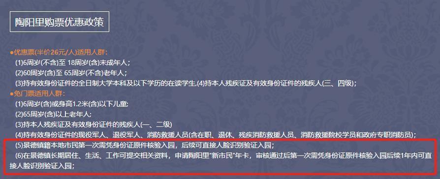 记者看到,在免门票适用人群里,景德镇籍本地市民第一次需凭身份证原件核验入园,后续可直接人脸识别验证入园;在景德镇长期居住、生活、工作可提交相关资料,申请陶阳里“新市民”年卡,审核通过后第一次需凭身份证原件核验入园后续1年内可直接人脸识别验证入园。