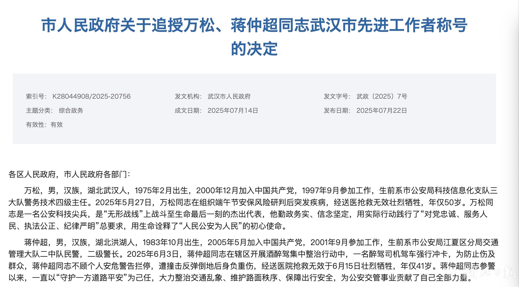 湖北日报讯(记者杨然)7月22日,武汉市人民政府发布《关于追授万松、蒋仲超同志武汉市先进工作者称号的决定》,号召全市广大干部群众以万松、蒋仲超同志为榜样,大力弘扬社会正气。