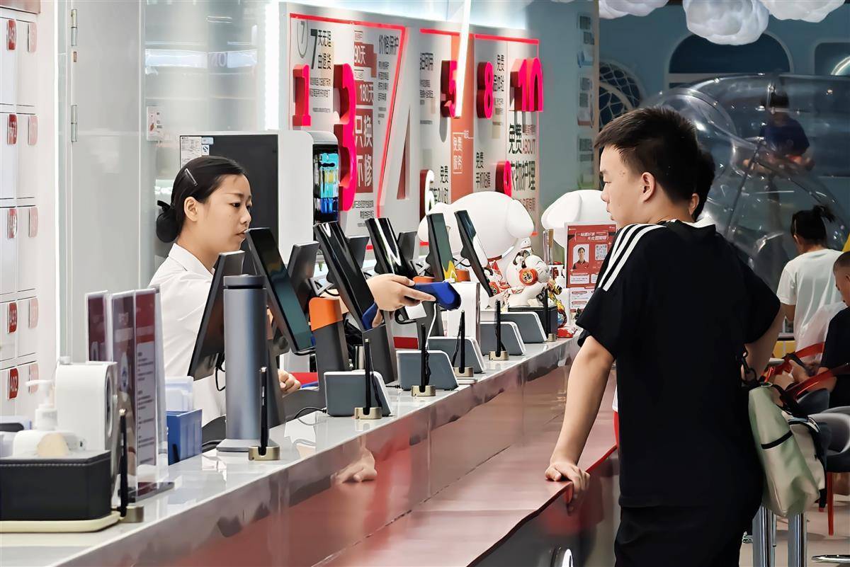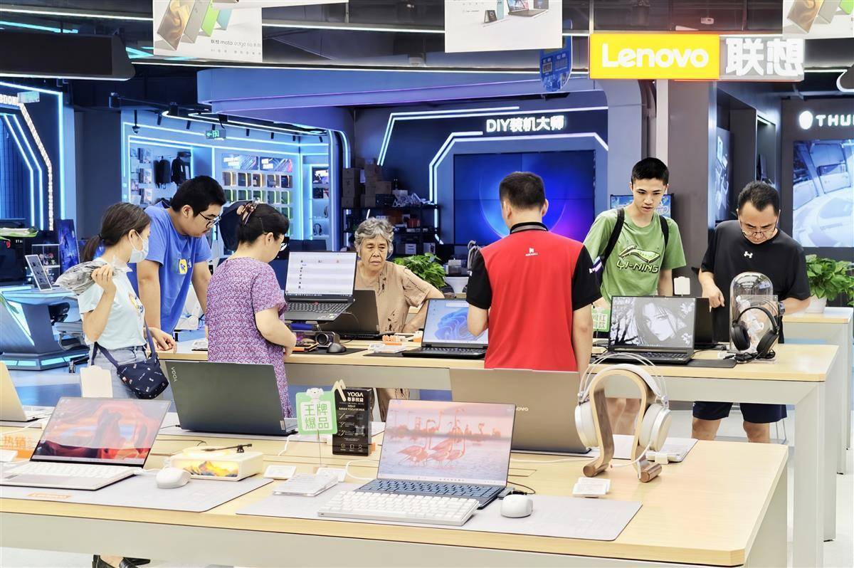 近日,武汉迎来暑期学生购机高峰。众多学生在家长陪同下实地体验最新笔记本电脑、平板等数码产品。7月22日,记者在武汉光谷京东MALL看到,卖场内设置多品牌体验区及学生专享优惠,导购员详细介绍配置性能与优惠方案,不少家庭现场完成选购。(湖北日报全媒记者 陈少哲 摄)