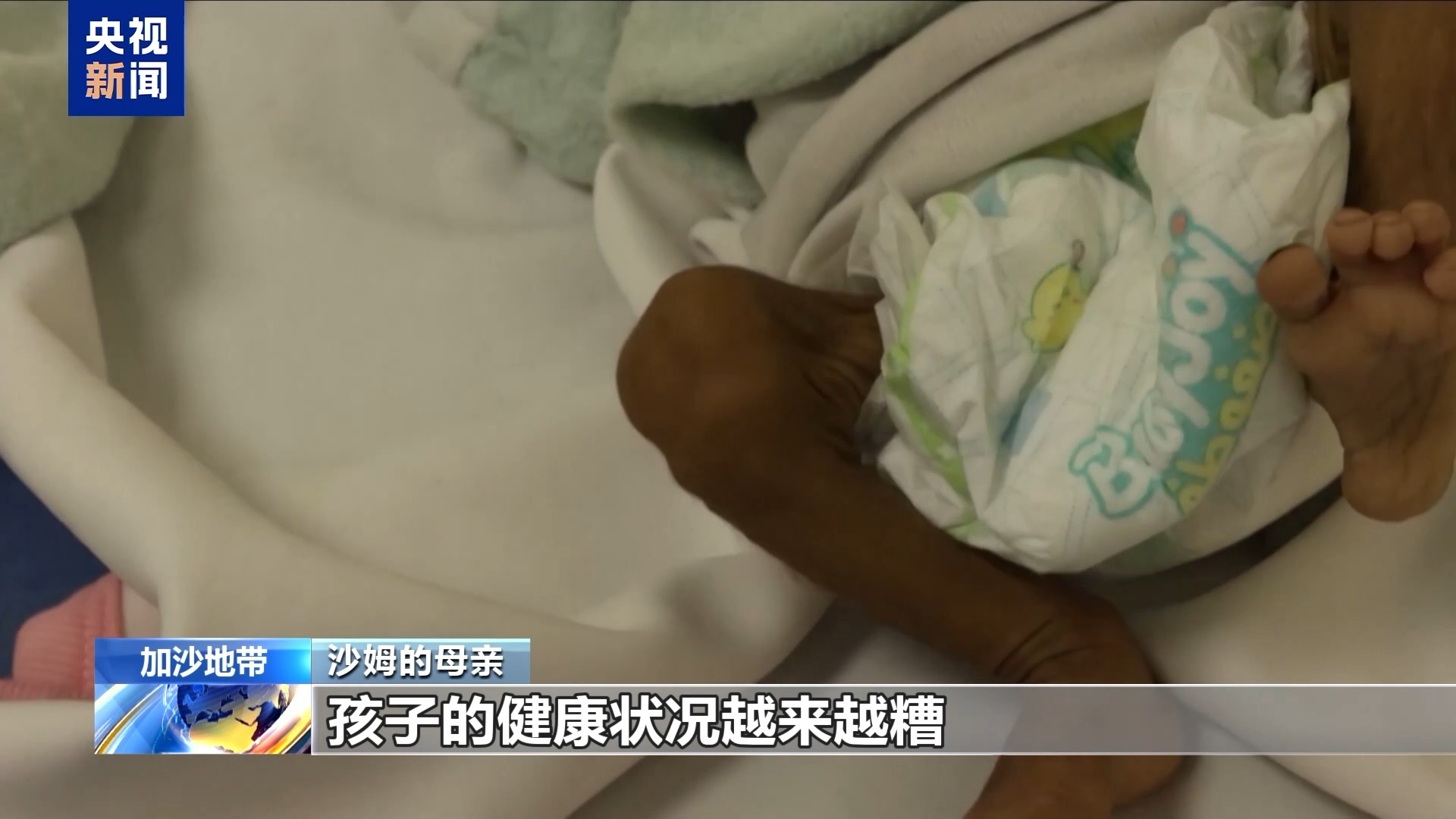 在位于加沙城的兰蒂西医院,这个名叫沙姆的婴儿正在虚弱地哭闹,严重的营养不良让她瘦成了皮包骨。