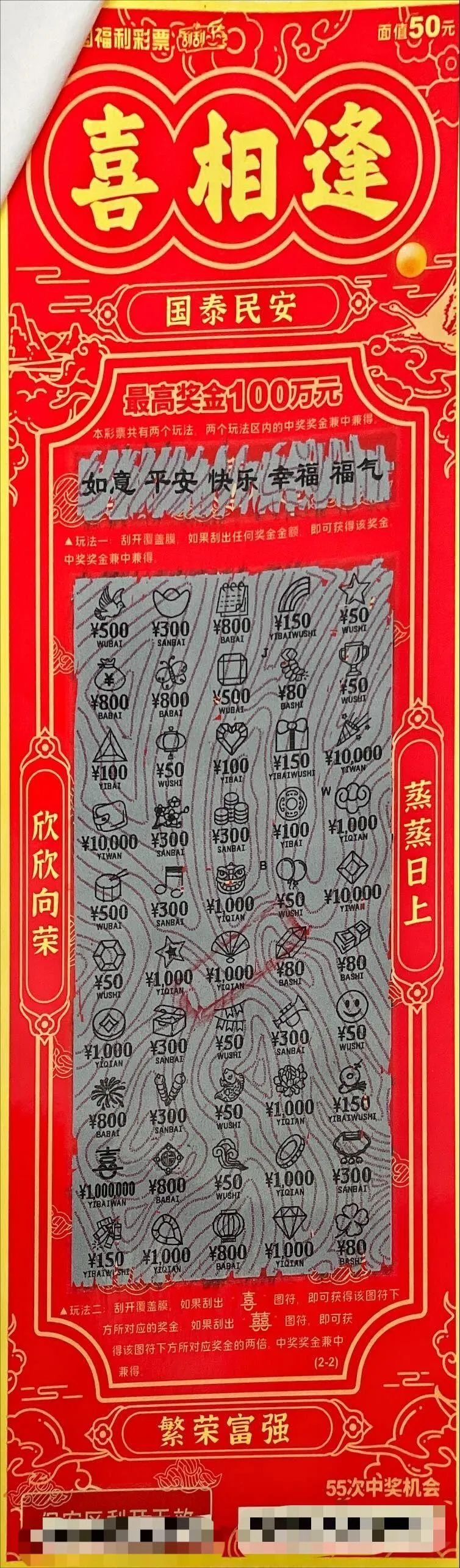 刚刮开第一张,就中了50元奖金。再刮开第二张,倒数第二排的最左边出现了一个“喜”字,对应的奖金是100万元。