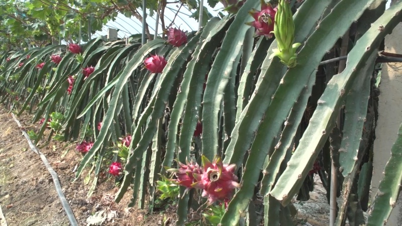 火龙果适宜温暖、湿润、半阴的环境条件,为应对夏季的高温,严河采摘园负责人宋开军有自己的巧思,在棚内套种了葡萄,“葡萄主要是为了给火龙果遮阴,火龙果喜欢阳光,但是温度太高了也不行。”