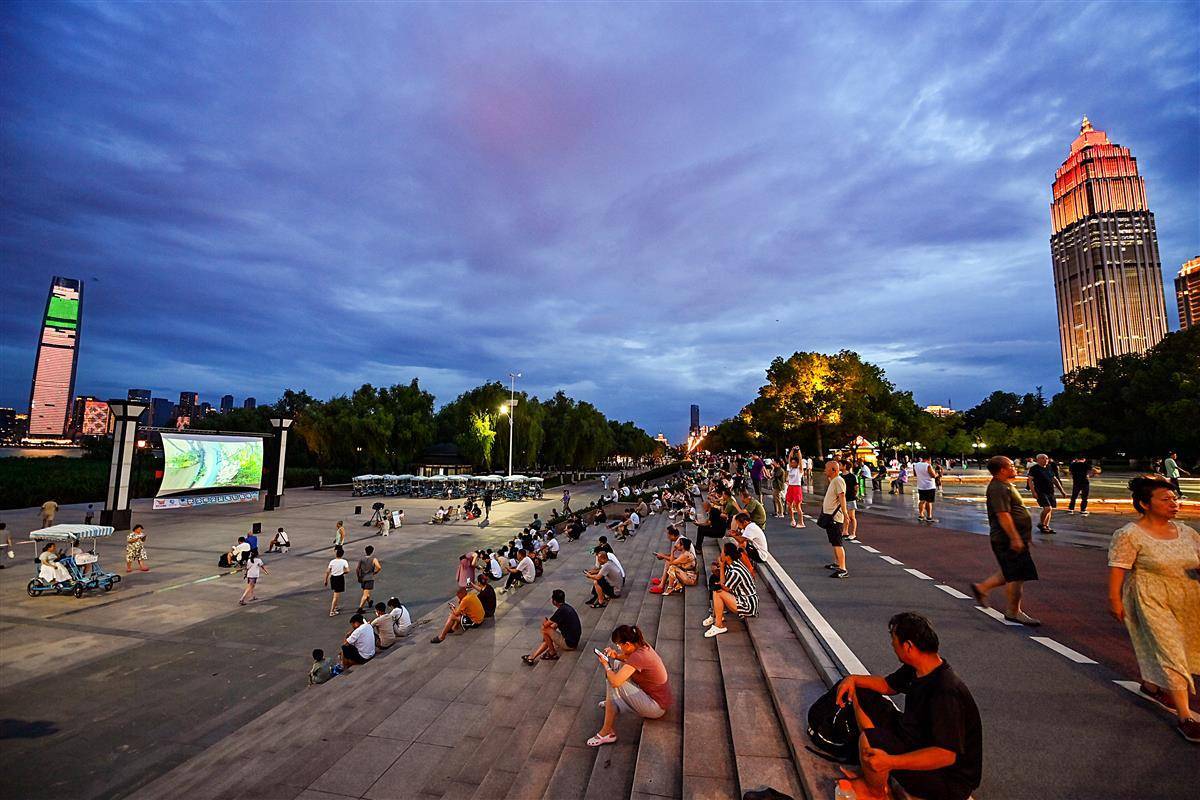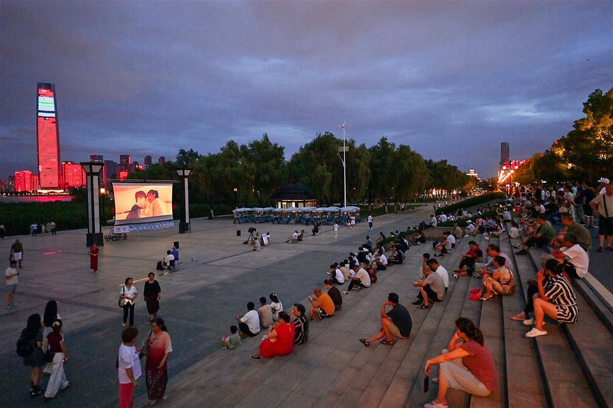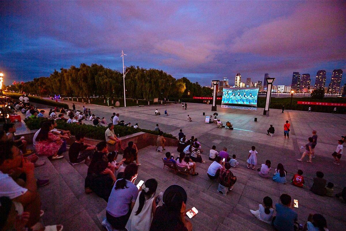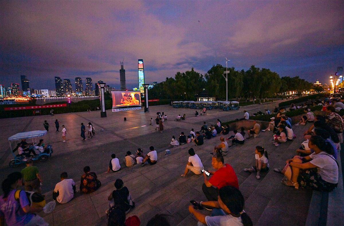 7月22日晚7时半,电影《一吻定情》准时在汉口江滩五福广场播放。夜幕降临,拂面而来清爽的江风,前来休闲散步的市民在广场上拾级而坐,看一场浪漫的露天电影。这里是很多爱看电影的武汉人的打卡地。(湖北日报全媒记者 朱熙勇 摄)