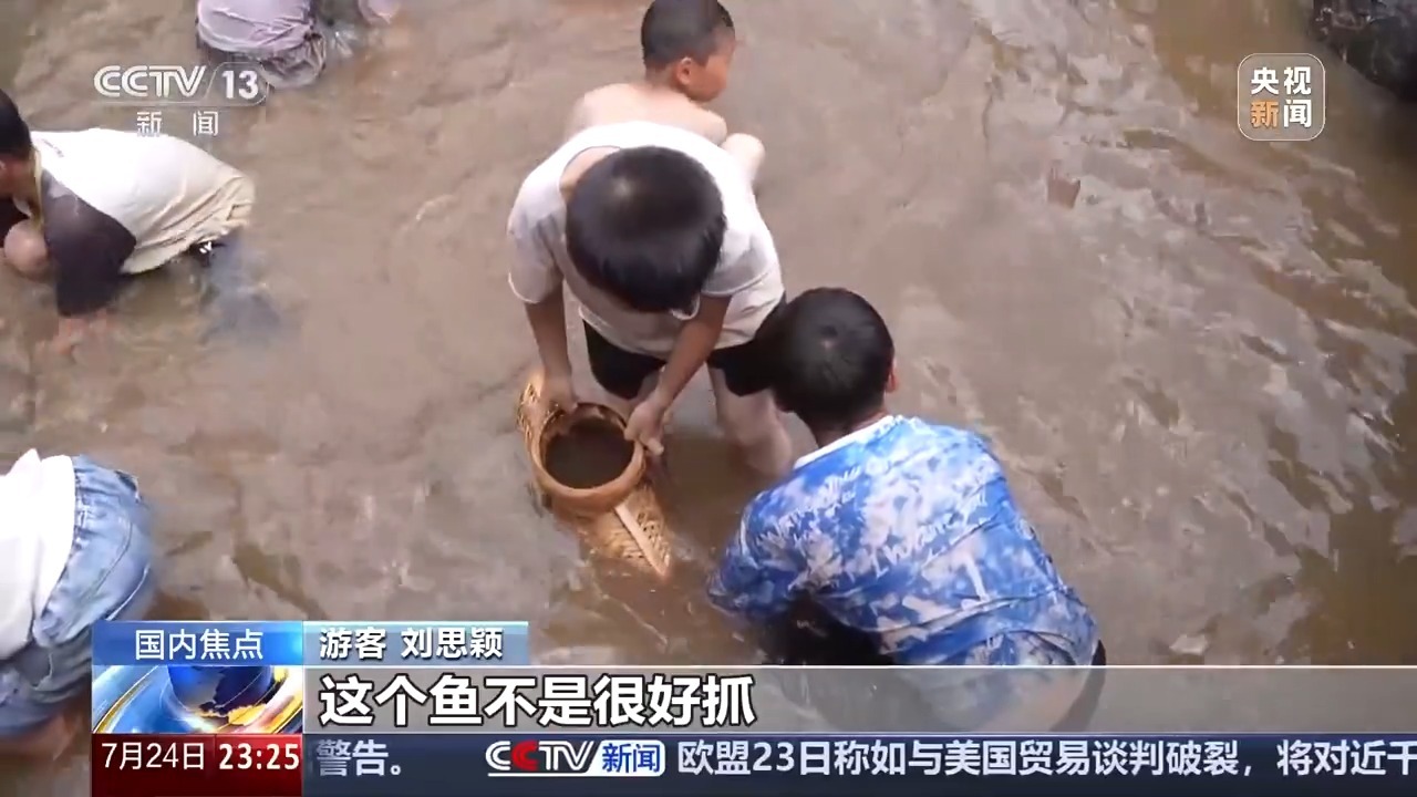 游客 刘思颖:之前都是在课本里认识这些,这次是实践。这个鱼不是很好抓,但是我看见村里的老人大部分都有经验,我们就跟着一起抓,一共捕获了七八条,有一条非常大。
