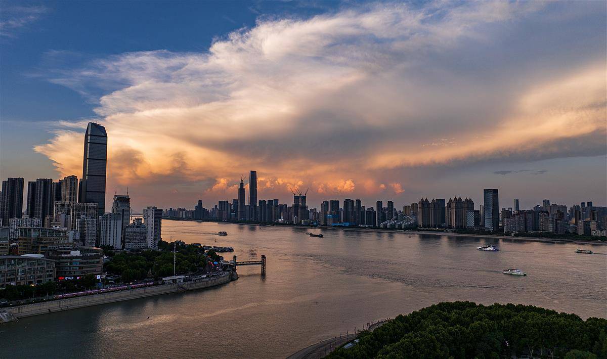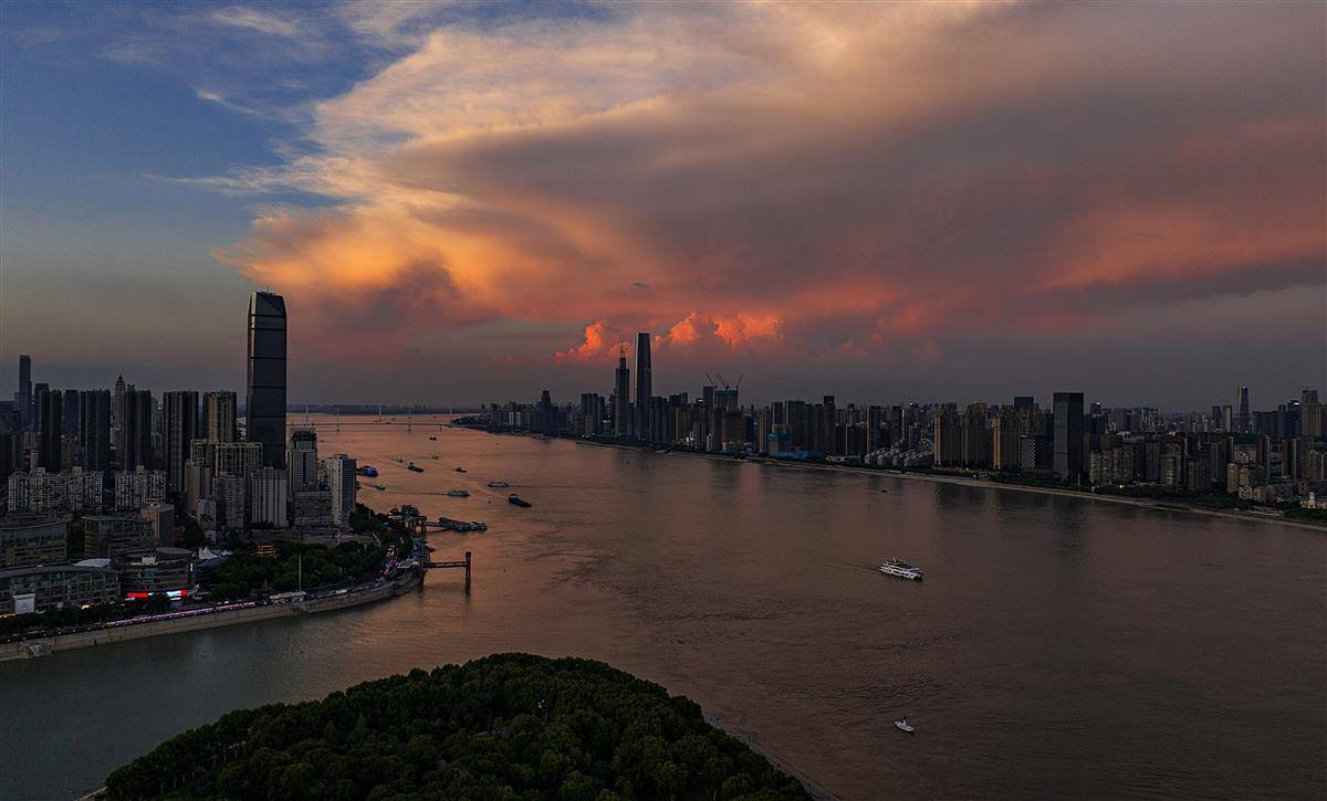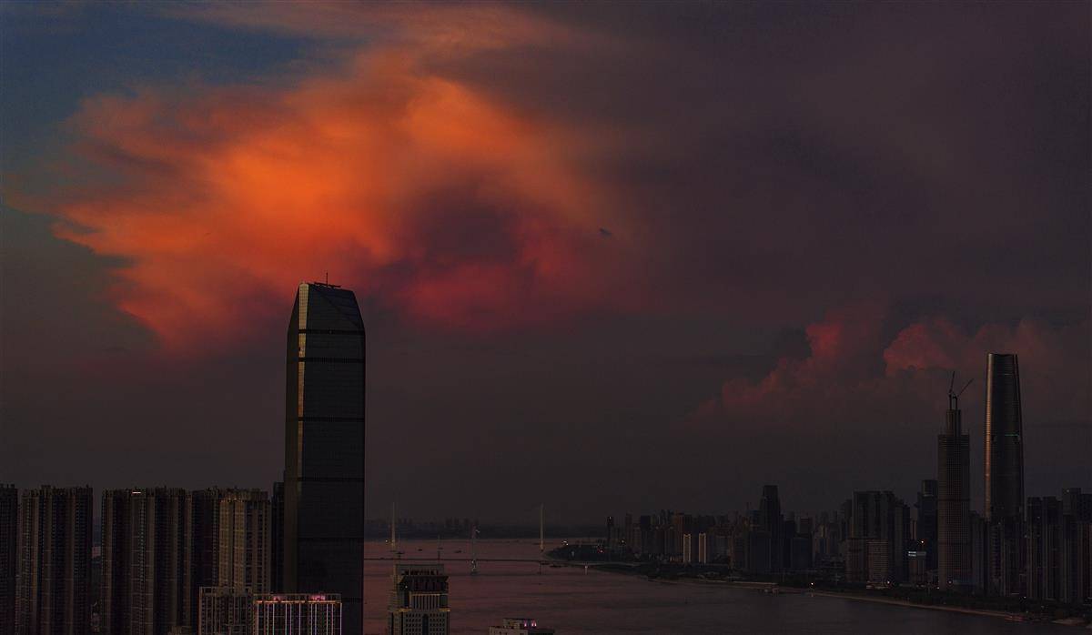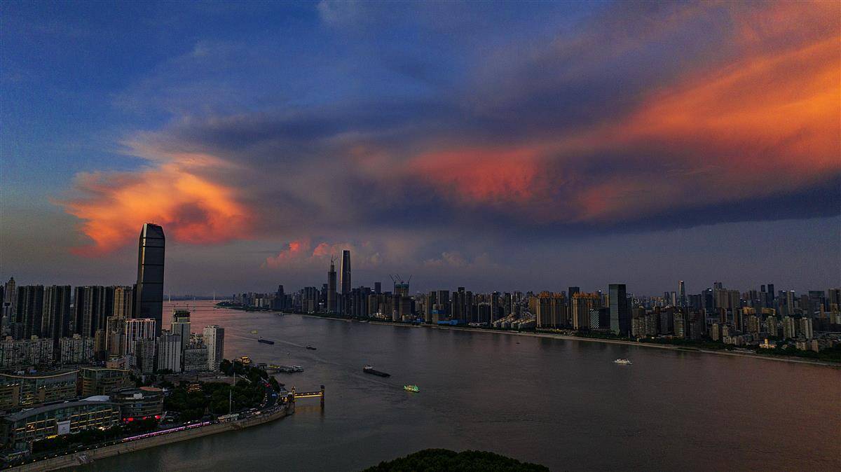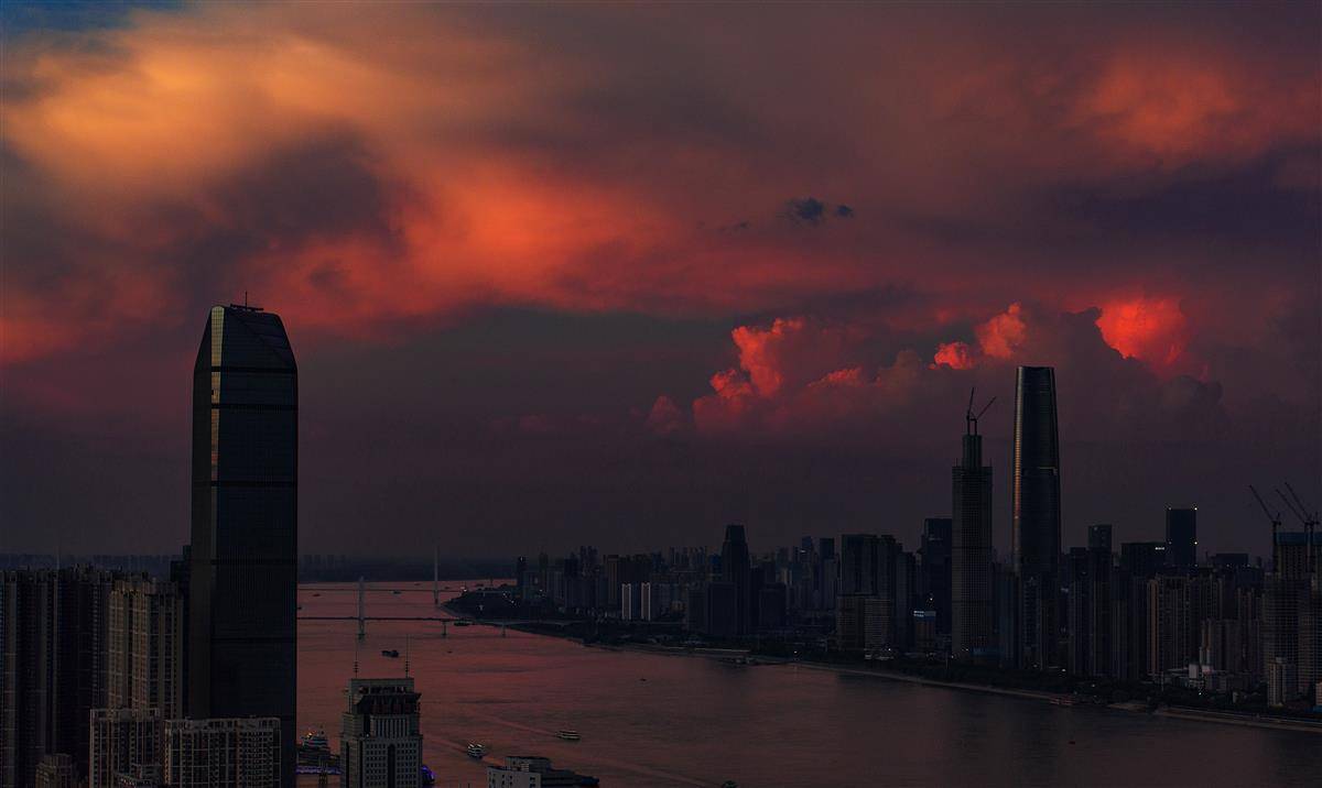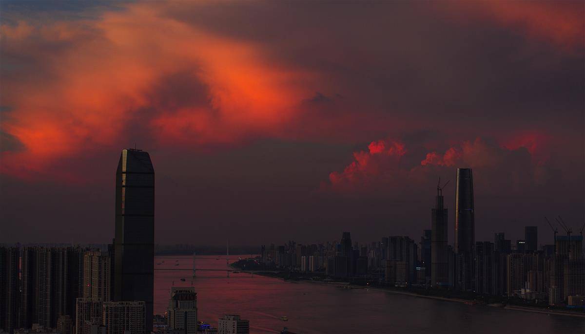 7月24日傍晚,武汉长江以及两岸高楼的上空笼罩在一片彩色的霞光之中,人们在下班回家途中收获这份难得一见的火烧云晚霞。(湖北日报全媒记者 朱熙勇 摄)