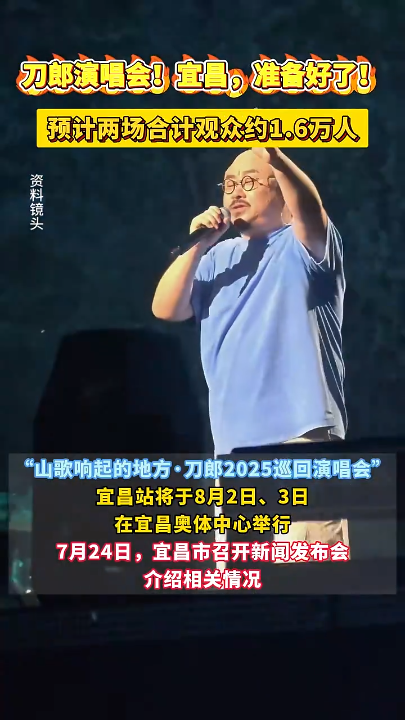 刀郎演唱会宜昌站将于8月2日、3日在宜昌奥体中心连续举办两场,预计吸引观众1.6万人。山歌即将响起,宜昌演艺经济再添火辣。