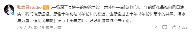 张碧晨方也在评论区发声:“一场源于某博主的舆论争议,意外将一首陪伴听众十年的好作品推向风口浪尖,我们倍感遗憾。感谢十年前与《年轮》的相遇,也感谢过去十年《年轮》带来的共鸣、泪水与力量,值此《年轮》发行十周年之际,好好和这首作品告个别。”