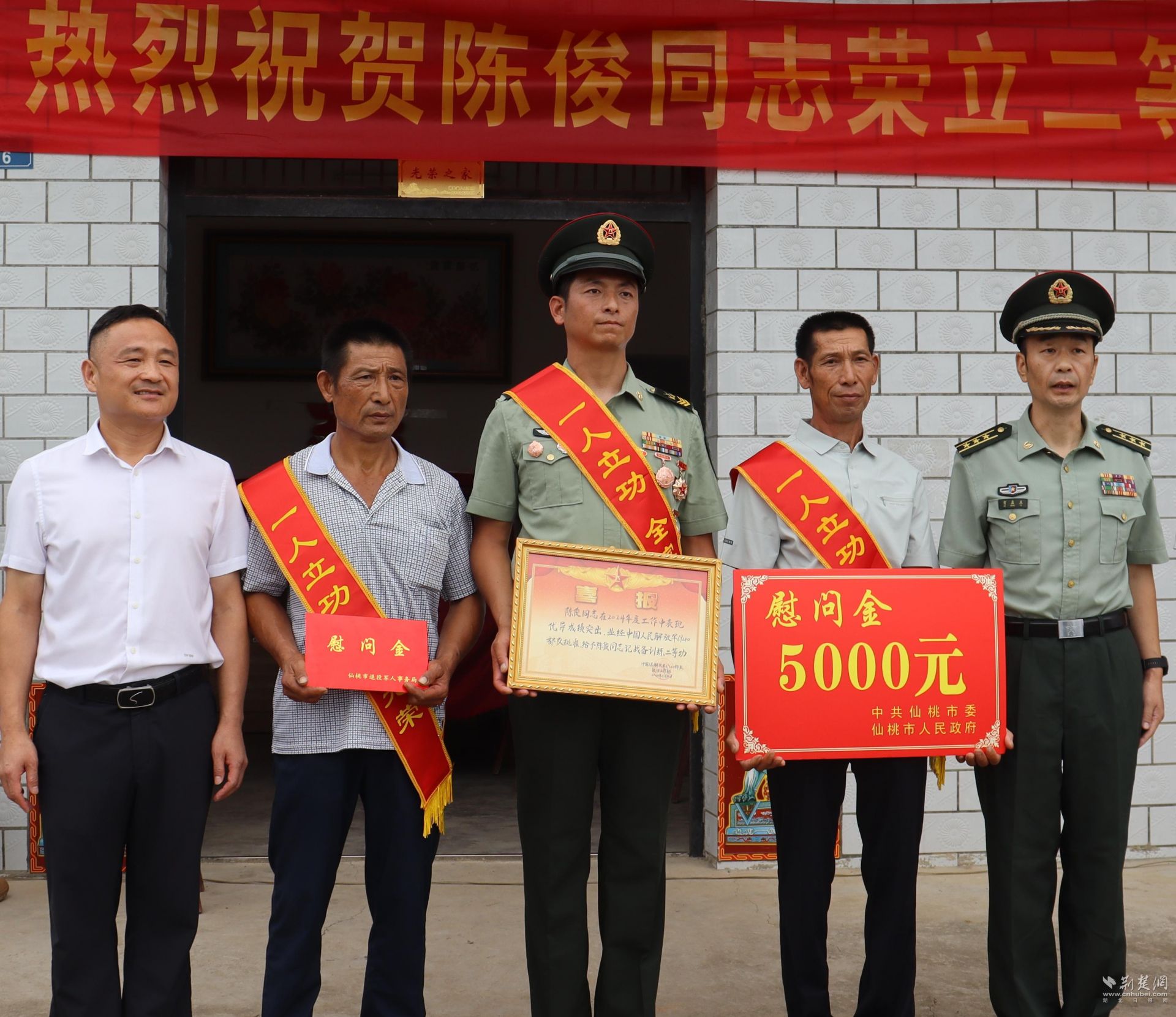荆楚网(湖北日报网)讯(通讯员 常梦星)鞭炮齐鸣贺英雄,乡音满巷迎功臣。7月23日上午,仙桃市退役军人事务局、市人武部、西流河镇组成的送喜报队伍带着“二等功臣之家”牌匾和慰问金,走进西流河镇周壕村陈俊家中,举办简朴而隆重的表彰仪式。