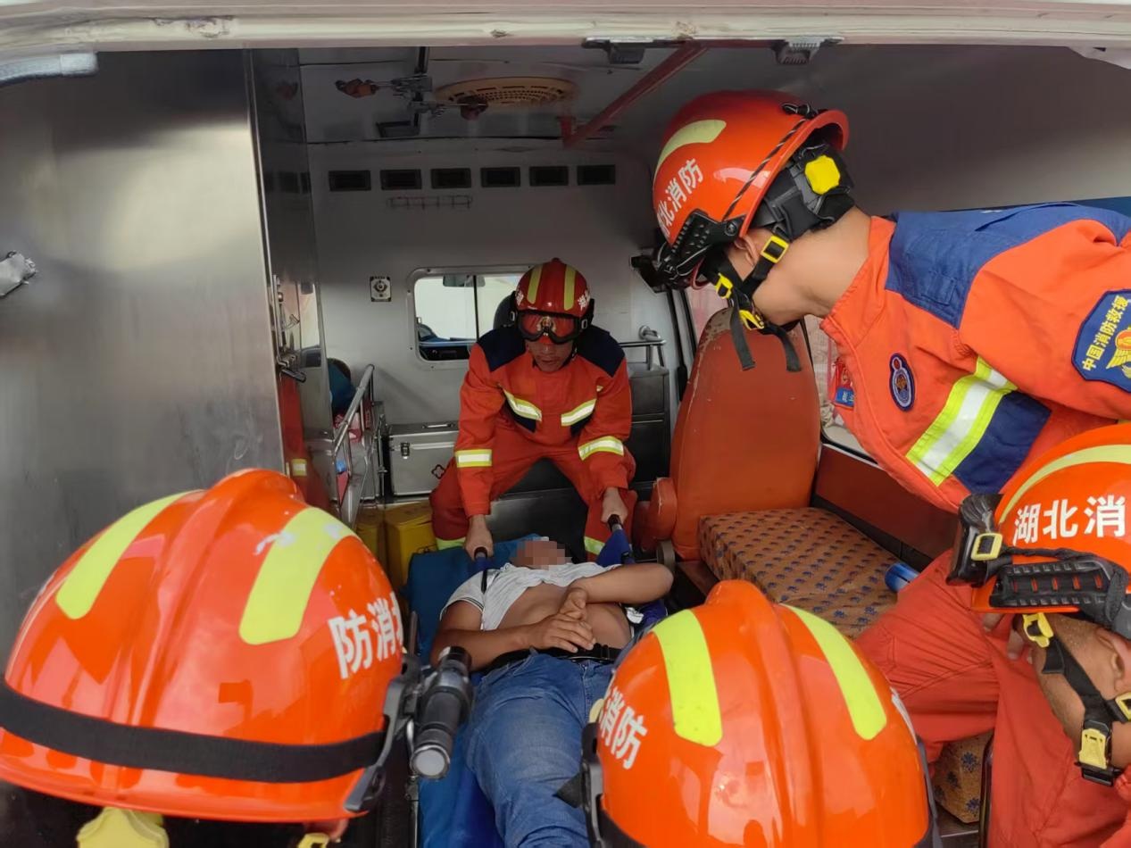 当日16时27分,武汉市消防救援指挥中心接到报警,迅速调派苗湖消防救援站出动1辆消防车、6名消防员赶赴现场。一名消防员攀爬至高空驾驶室,发现一名男子已昏迷倒地,身旁工作人员正焦急地为其扇风进行物理降温。