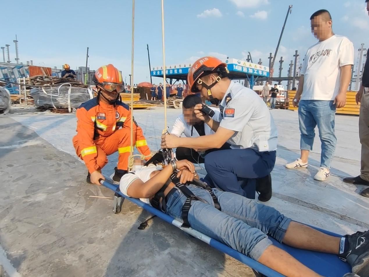 一场高效协同救援随即展开!另一名消防员迅速携带专业绳索救援装备登塔增援。与此同时,地面队员组织工地人员紧急清理塔吊下方杂物,开辟救援操作区,并为可能的云梯车作业做好准备。