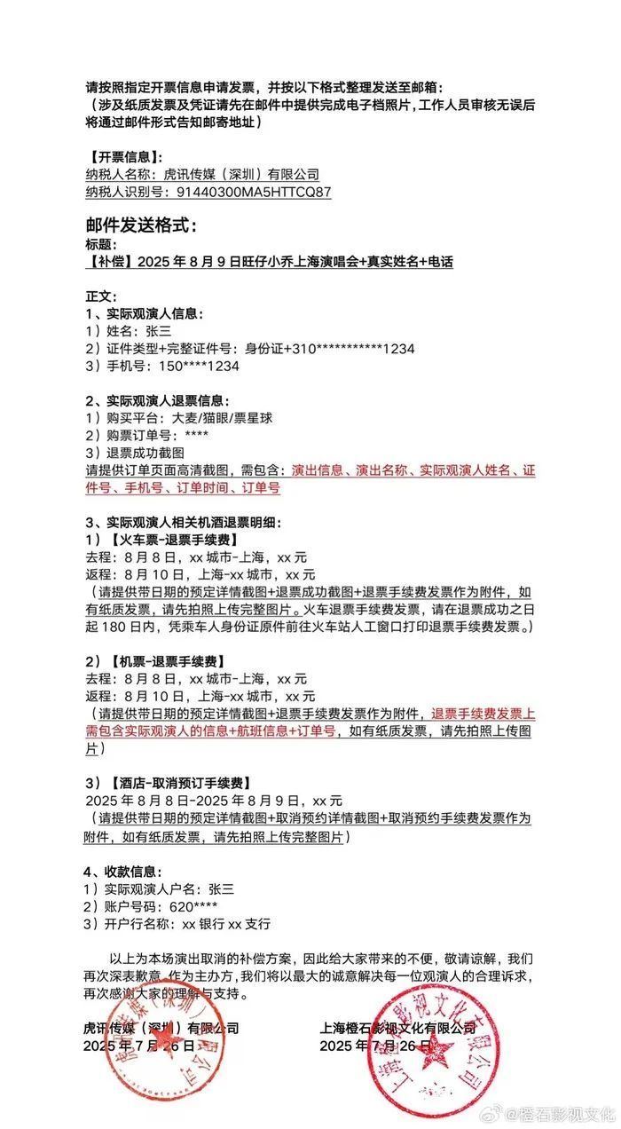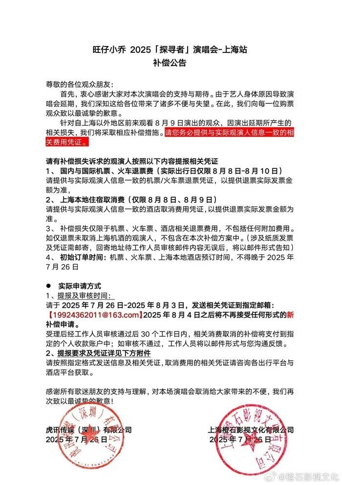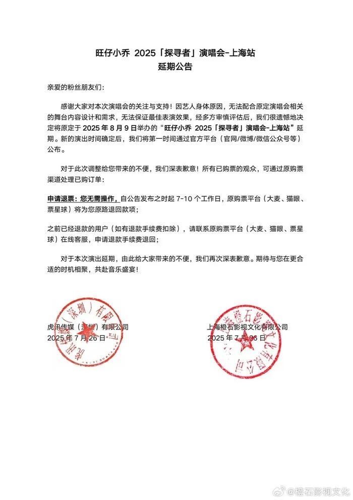 7月26日,旺仔小乔演唱会主办方发布延期补偿公告。公告称,因艺人身体原因,无法配合原定演唱会相关的舞台内容设计和需求,无法保证最佳表演效果,经多方审慎评估后,决定将原定于2025年8月9日举办的“旺仔小乔2025「探寻者」演唱会-上海站”延期。新的演出时间确定后,将第一时间通过官方平台公布。