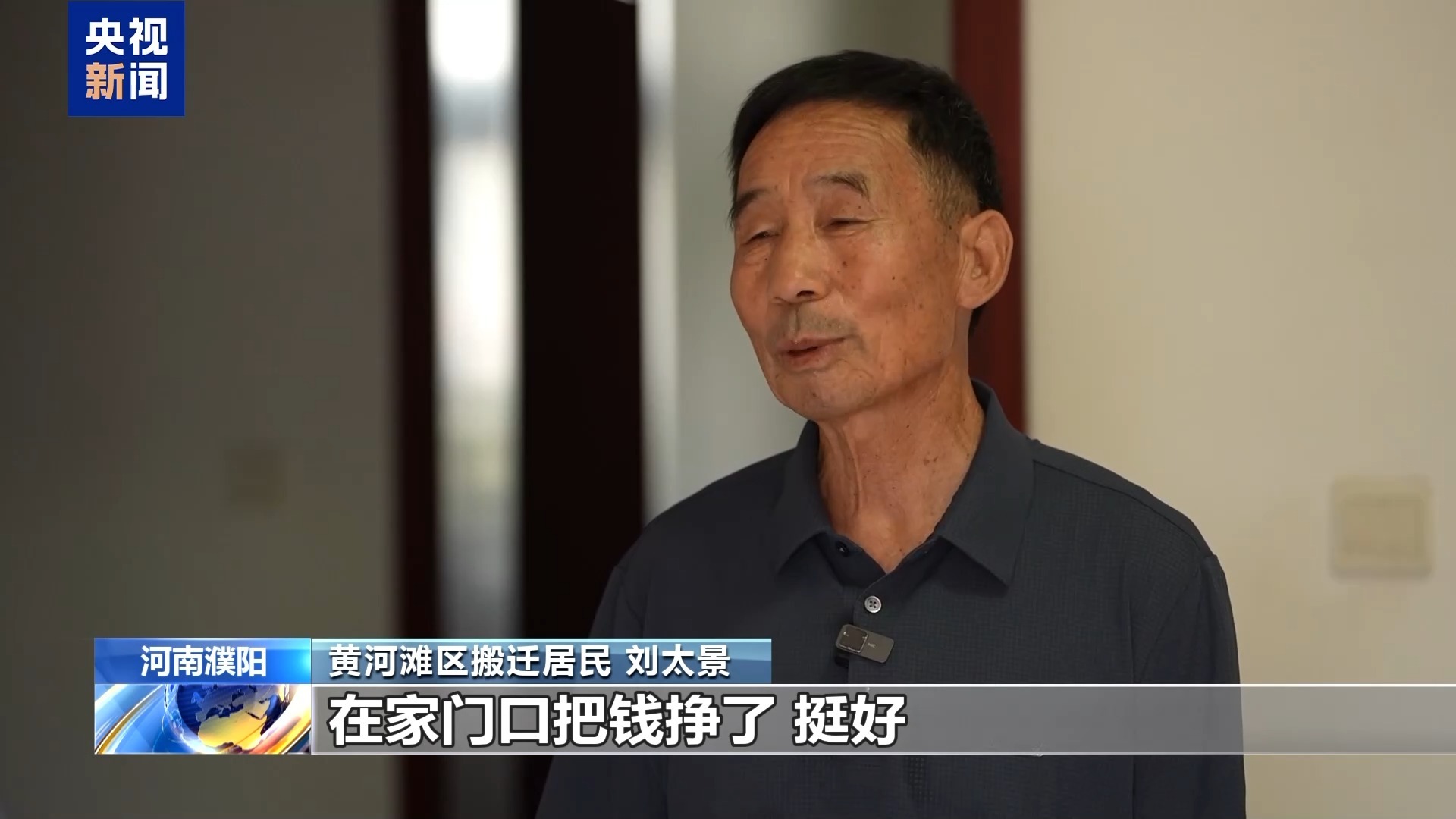 黄河滩区搬迁居民 刘太景:那些年汛期涨水比较频繁,有时晚上床上都有水,每到汛期还是提心吊胆。原先孩子全国各地跑着打工,现在在工业园区,在家门口把钱挣了,挺好。