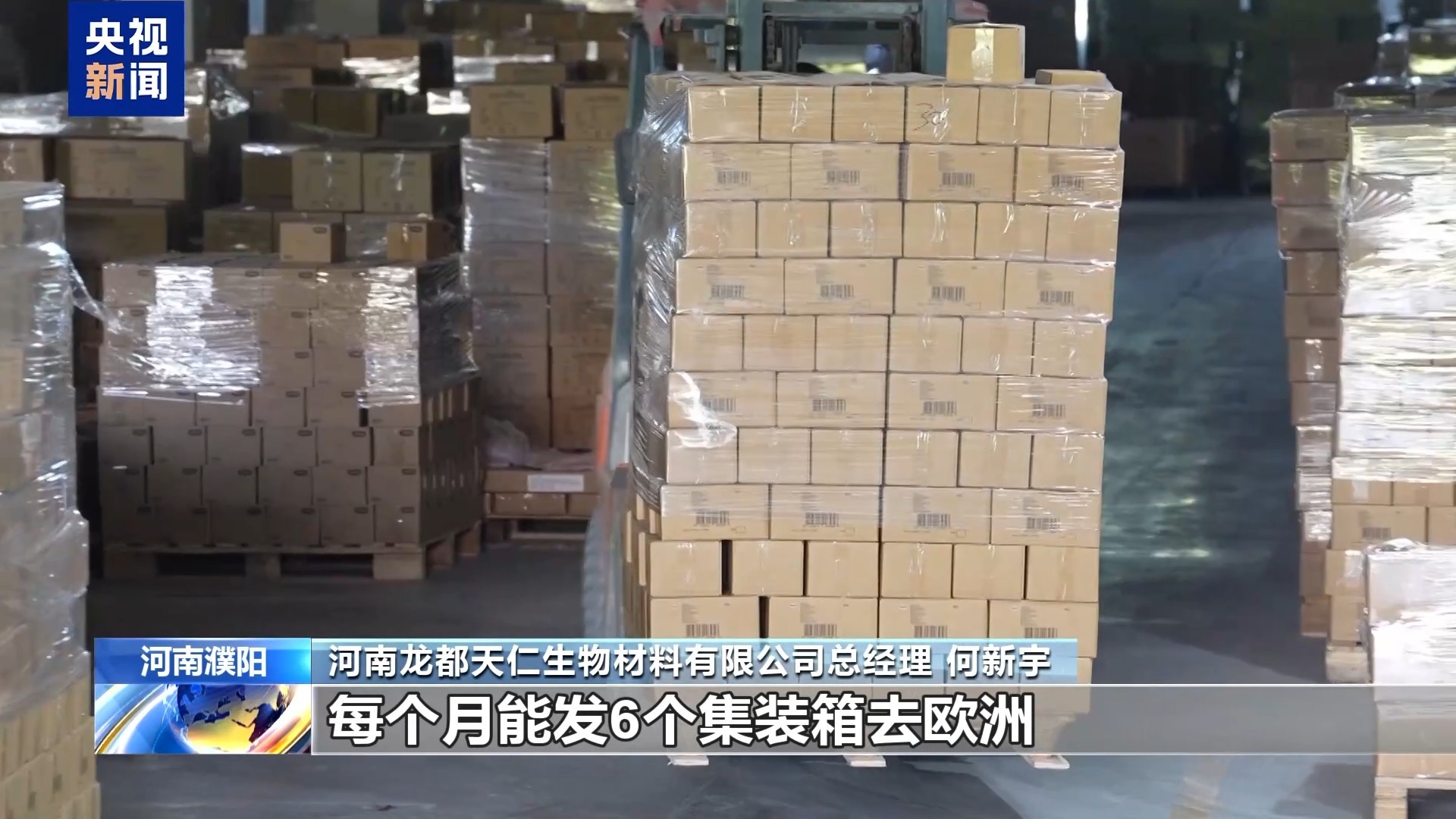 河南龙都天仁生物材料有限公司总经理 何新宇:这个产品在一年内能够100%降解成二氧化碳和水,一个集装箱能装26吨,每个月能发6个集装箱去欧洲。去年这个产品出口创汇达到1500万美金,今年的销售额和发货量都略有增长。